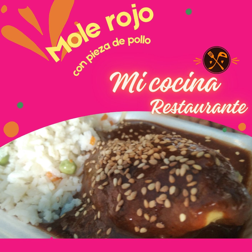 Mole rojo con pieza de pollo , acompañado de arroz y frijoles