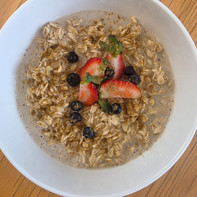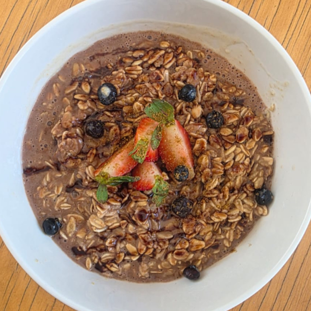 Avena caliente con leche vegetal, chocolate y topping de frutos rojos