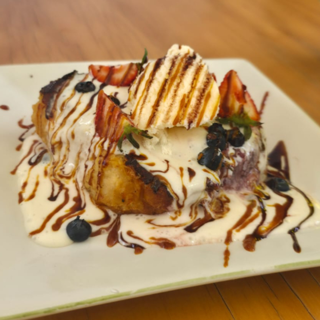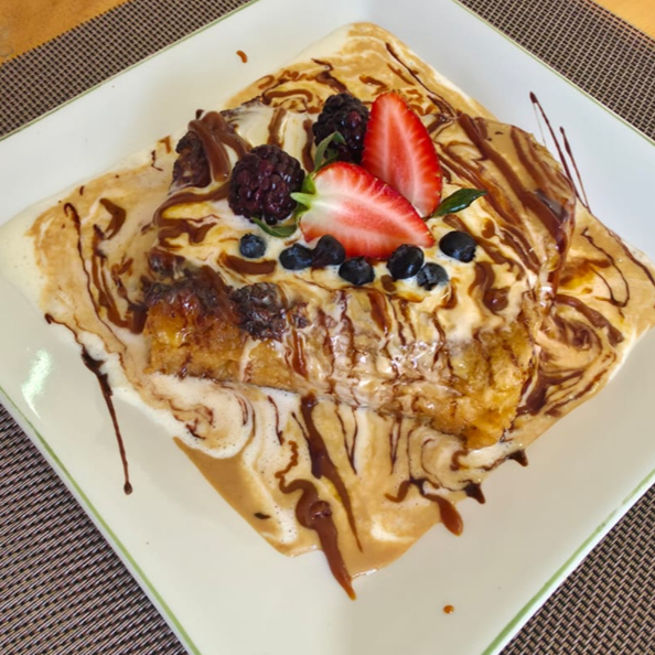 Relleno de frutos rojos, salsa cremosa, caramelo y helado de vainilla