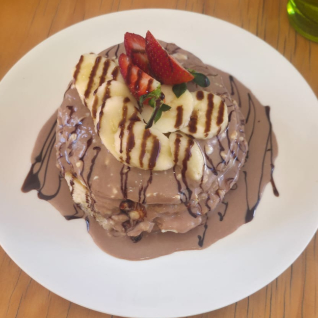 Bañado con salsa de caramelo, plátano, fresas y chocolate