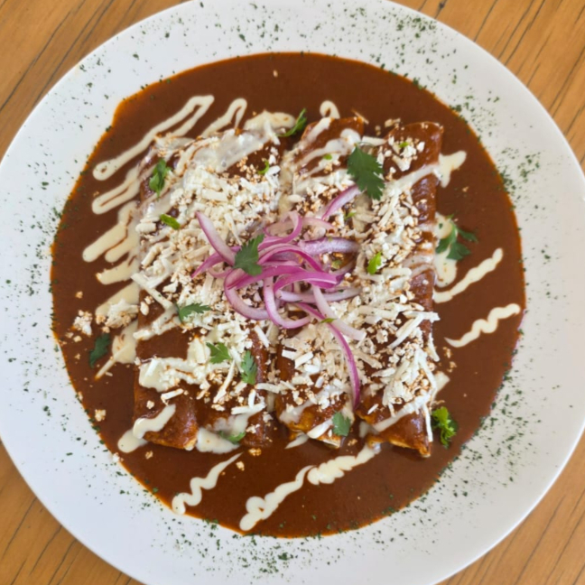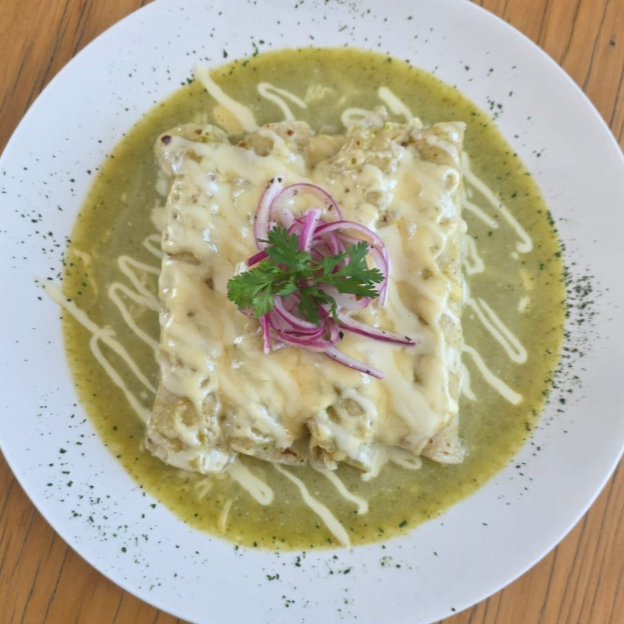 Clásicas enchiladas rellenas de pollo o queso asadero, bañadas en salsa verde cremosa y gratinadas con queso manchego