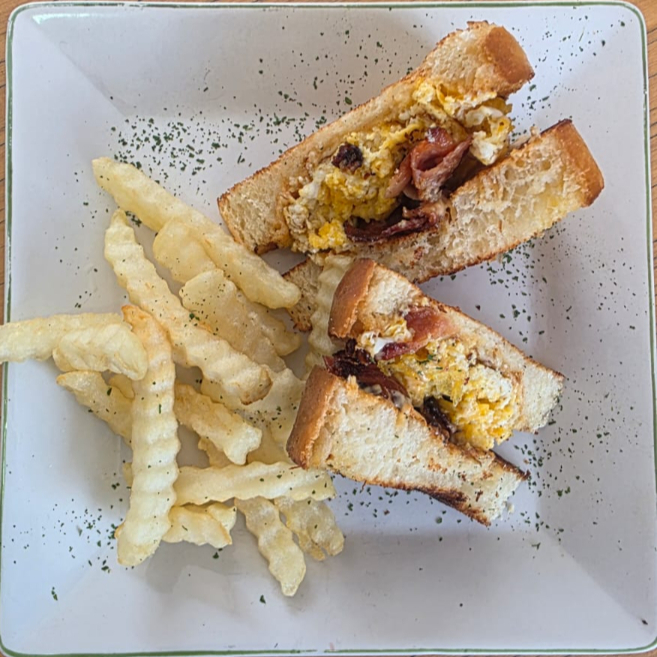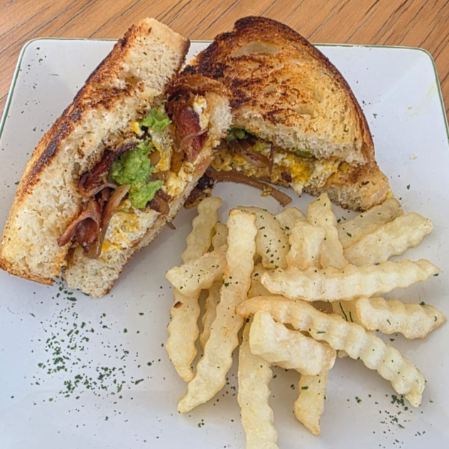 Sándwich elaborado con pan brioche artesanal, tostado con mantequilla especial de ajo, huevo, queso manchego, tocino, jamón, alioli de chipotle, acompañado con papas a la francesa