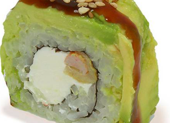 Con Aguacate por fuera camaron empanizado,queso philadelphia,tampico y salsa kushiage.
