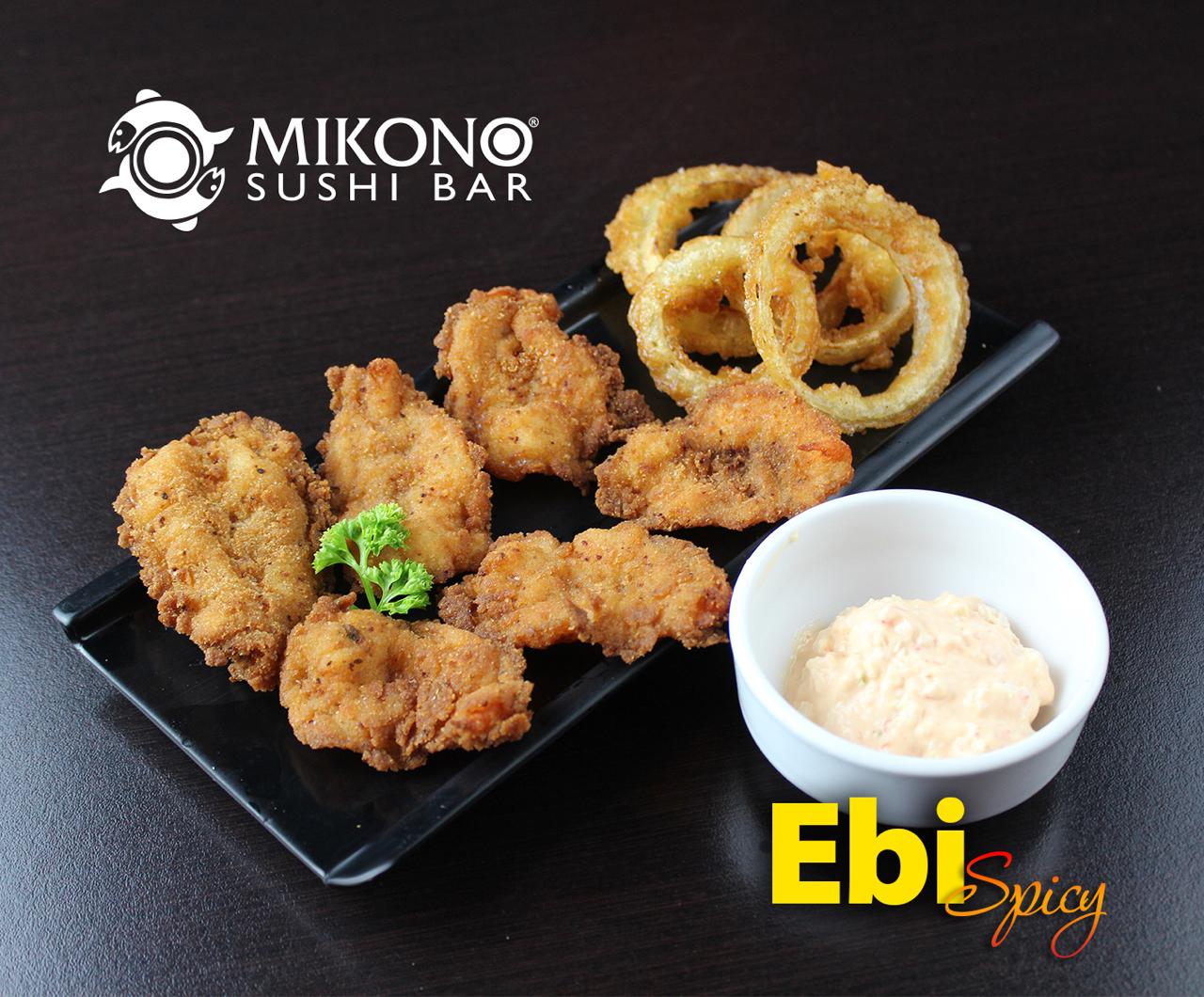 6 Piezas de crujientes camarones preparados con aderezo spicy + 2 aros de cebolla .