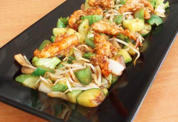 Pasta Integral con camaron ,verduras y salsa agridulce