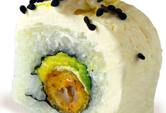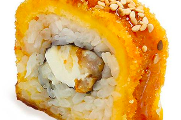 Mango fuera ,camaron empanizado,trocitos crujientes de tempura y queso philadelphia.