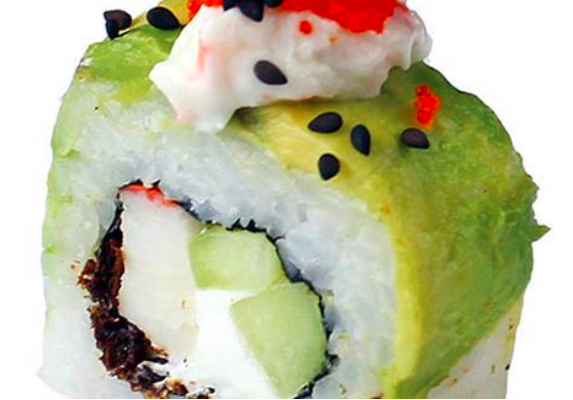 con aguacate por fuera,cangrejo,pepino,queso philadelphia,piel de salmon,tampico y mazago.