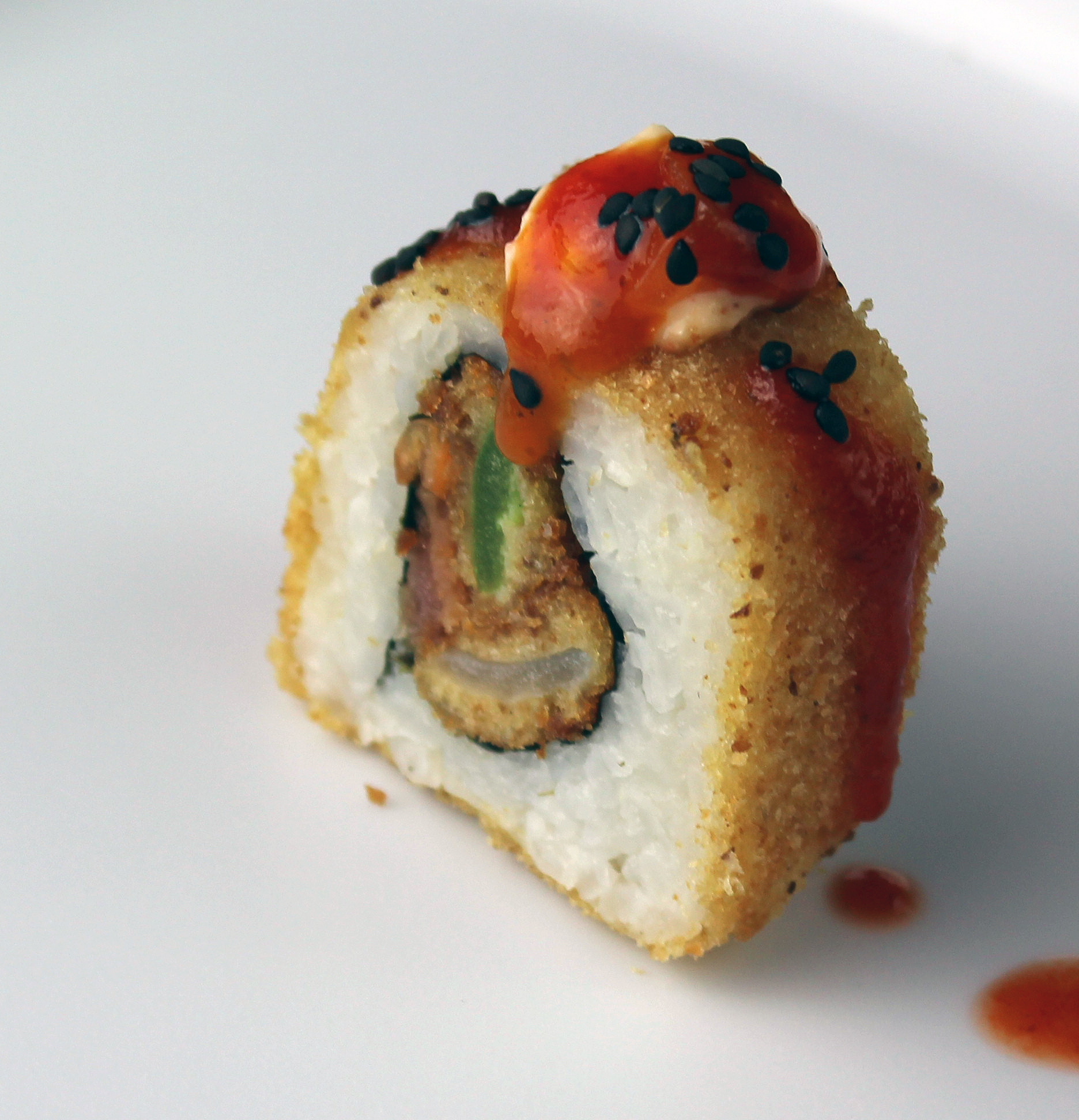 Tempura por fuera,surimi,chile toreado,queso de cabra,aguacate,cebollin,salsa spicy,ajonjoli y condimento de camaron.
