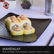 Mango y aguacate por fuera,camaron empanizado,queso philadelphia y cangrejo en tempura.