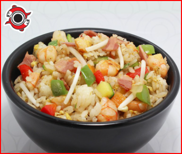 Arroz frito con huevo, camarones, tocino germen de soya y verduras