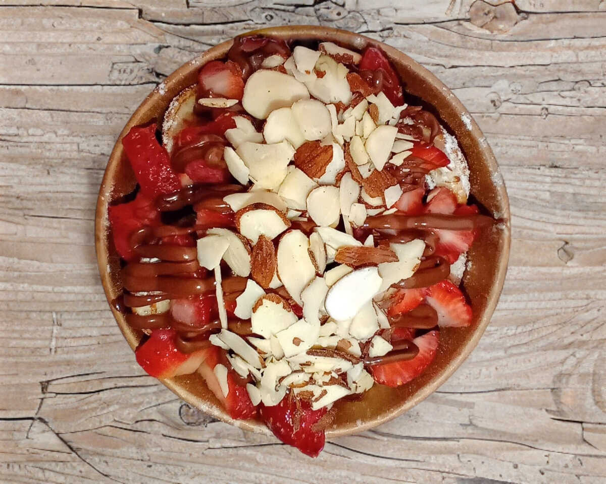 Orden de 15 mini hotcakes acompañados de Fresa , almendra rebanada y Nutella