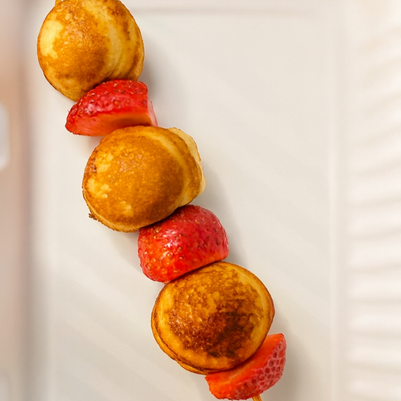 Brocheta de 3 miniHotcake acompañado de fruta y miel maple