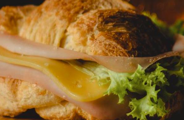 Nuestro cuernito de mantequilla recién horneado con finas rebanadas de jamón de pavo o pierna, queso manchego, lechuga romana y jitomate. Pídelo con aderezo chipotle