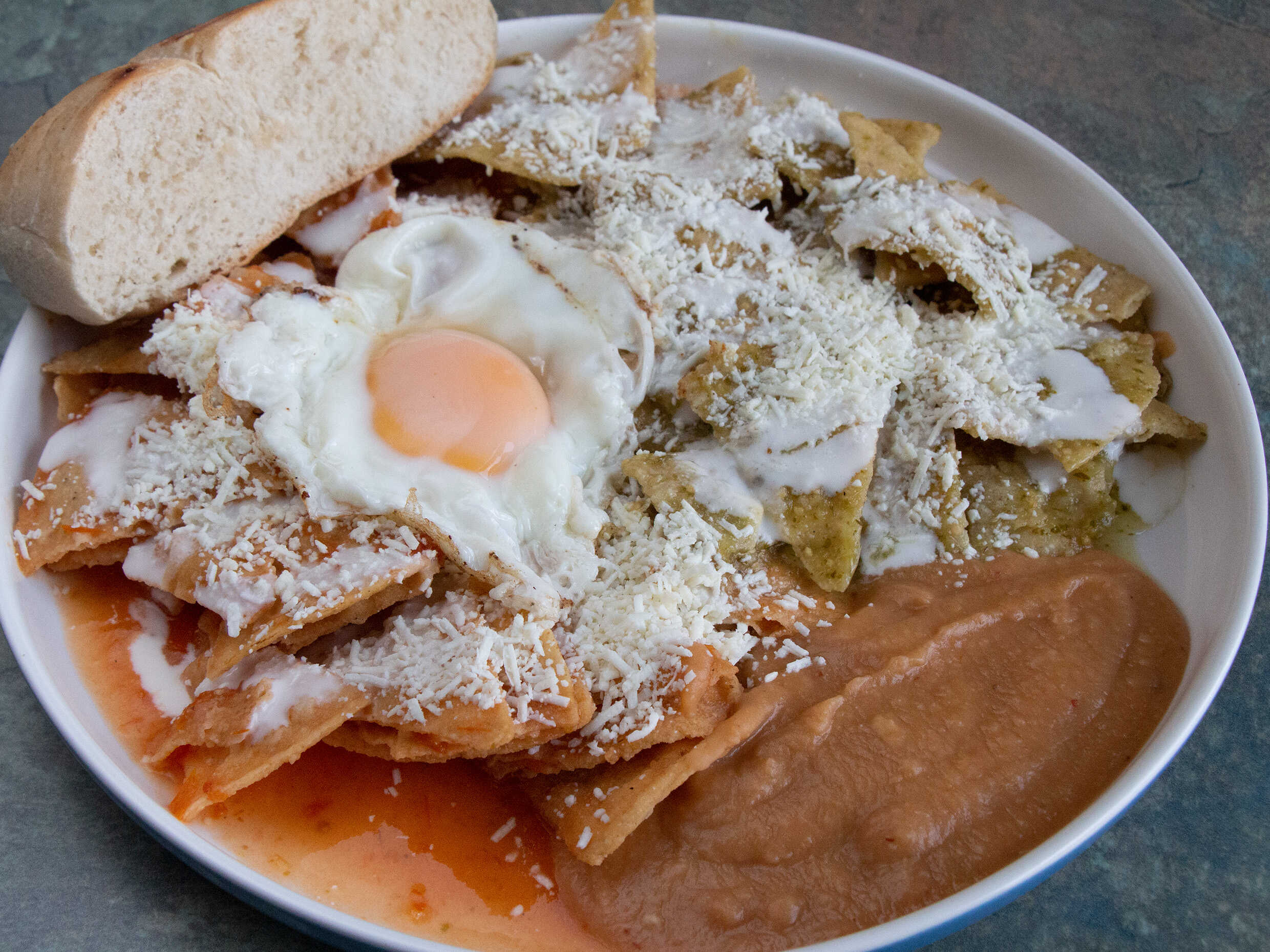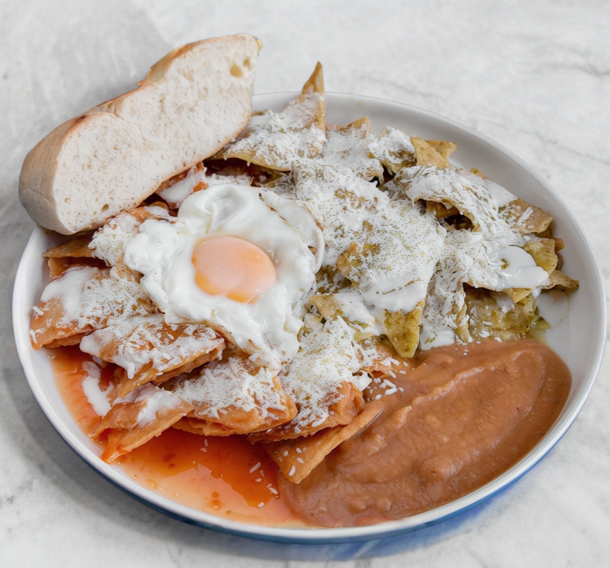 chilaquiles rojos y verdes, servidos con queso, crema, frijoles y huevo al gusto revuelto o estrellado