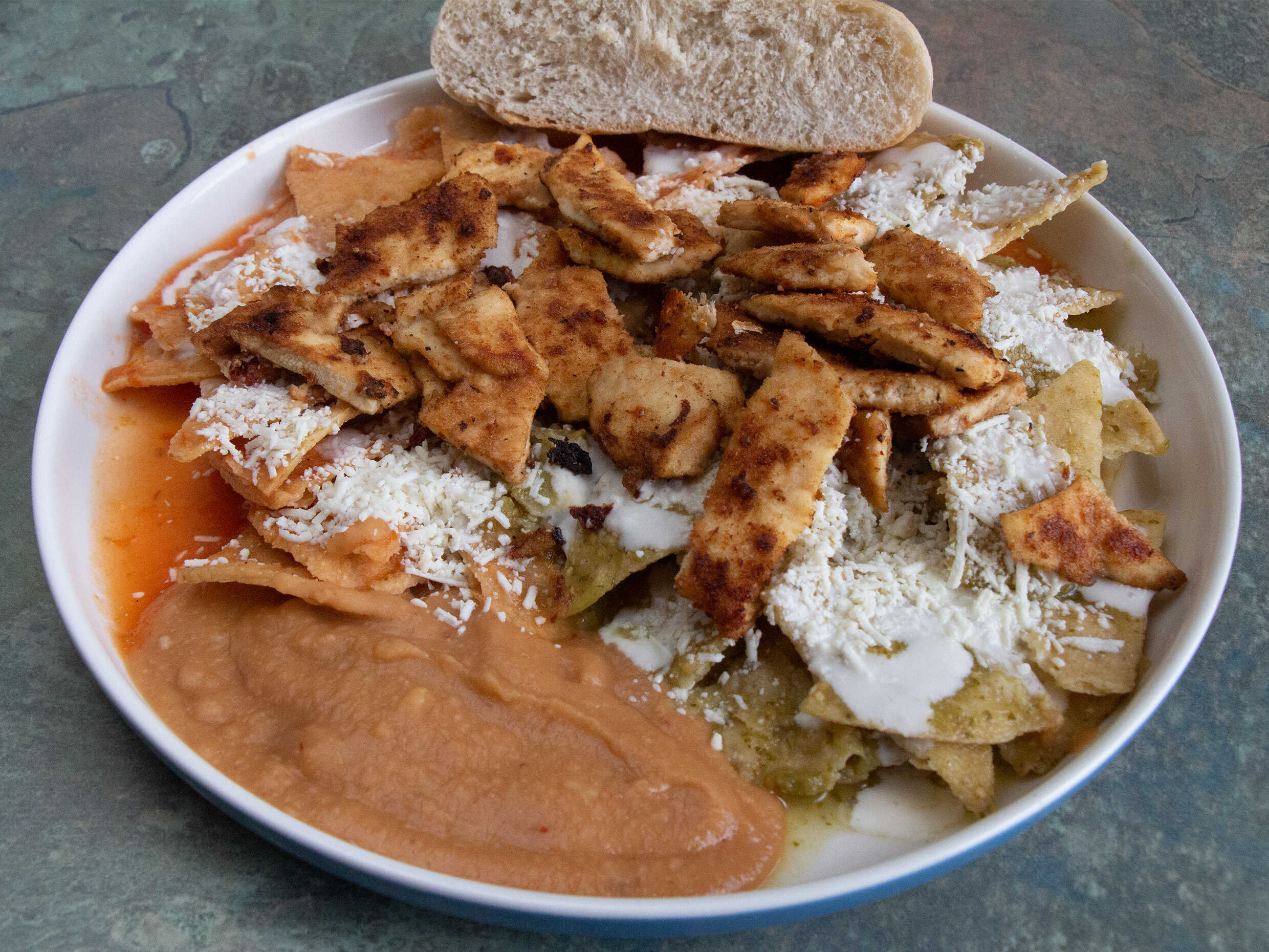 chilaquiles combinados rojos y verdes, servidos con queso, crema y milanesa de pollo.