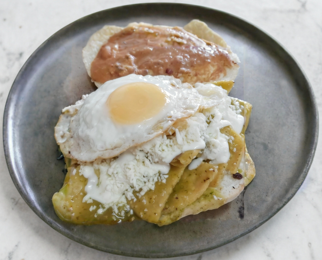 Chilaquiles verdes, servidos con queso, crema y frijoles. Puedes elegir un huevo revuelo o estrellado