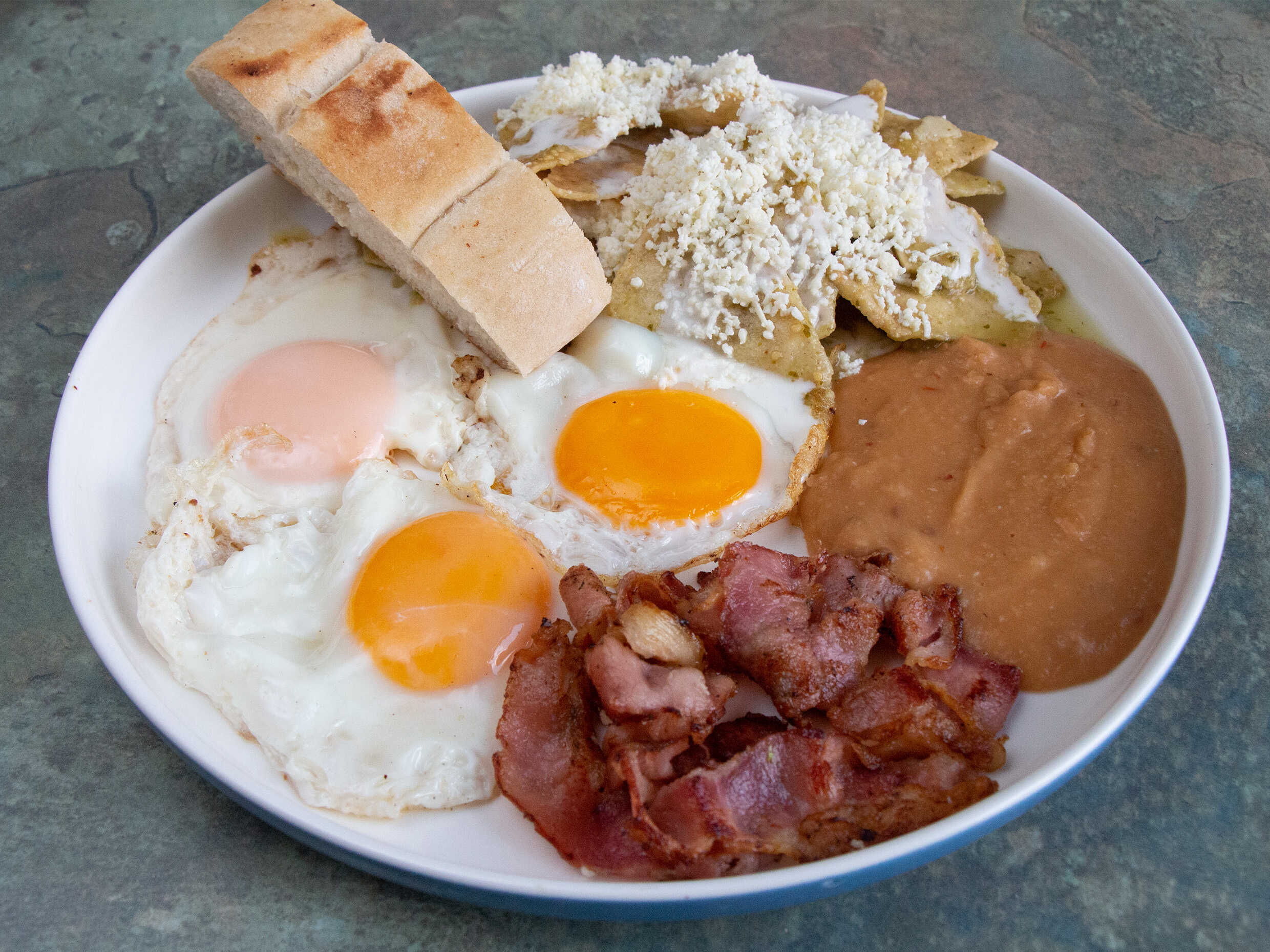 3 huevos revueltos o estrellados, servidos con frijoles, chilaquiles, queso y crema.