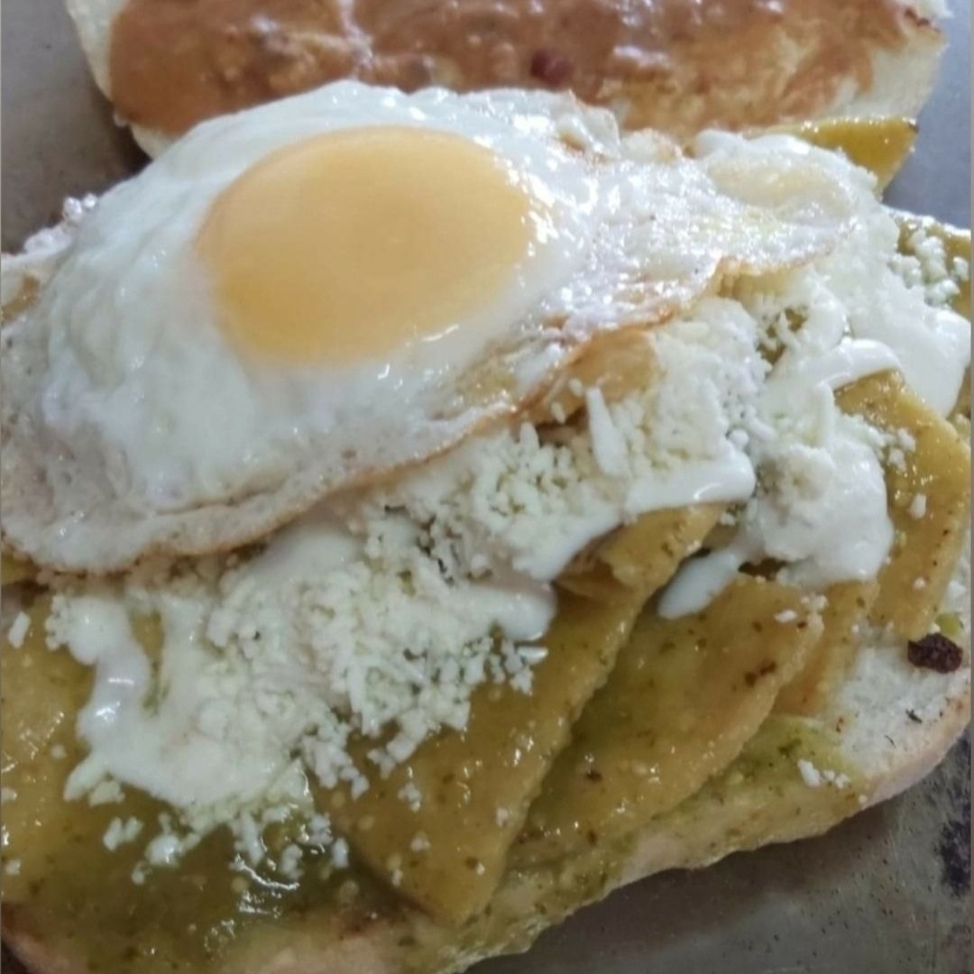Torta de chilaquiles rojos preparaos con crema, queso ranchero, frijoles y 1 huevo al gusto revuelto o estrellado