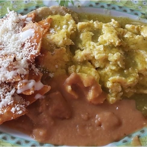 3 huevos revueltos sobre tortilla de maíz, bañados con salsa verde, acompañados con frijoles y chilaquiles