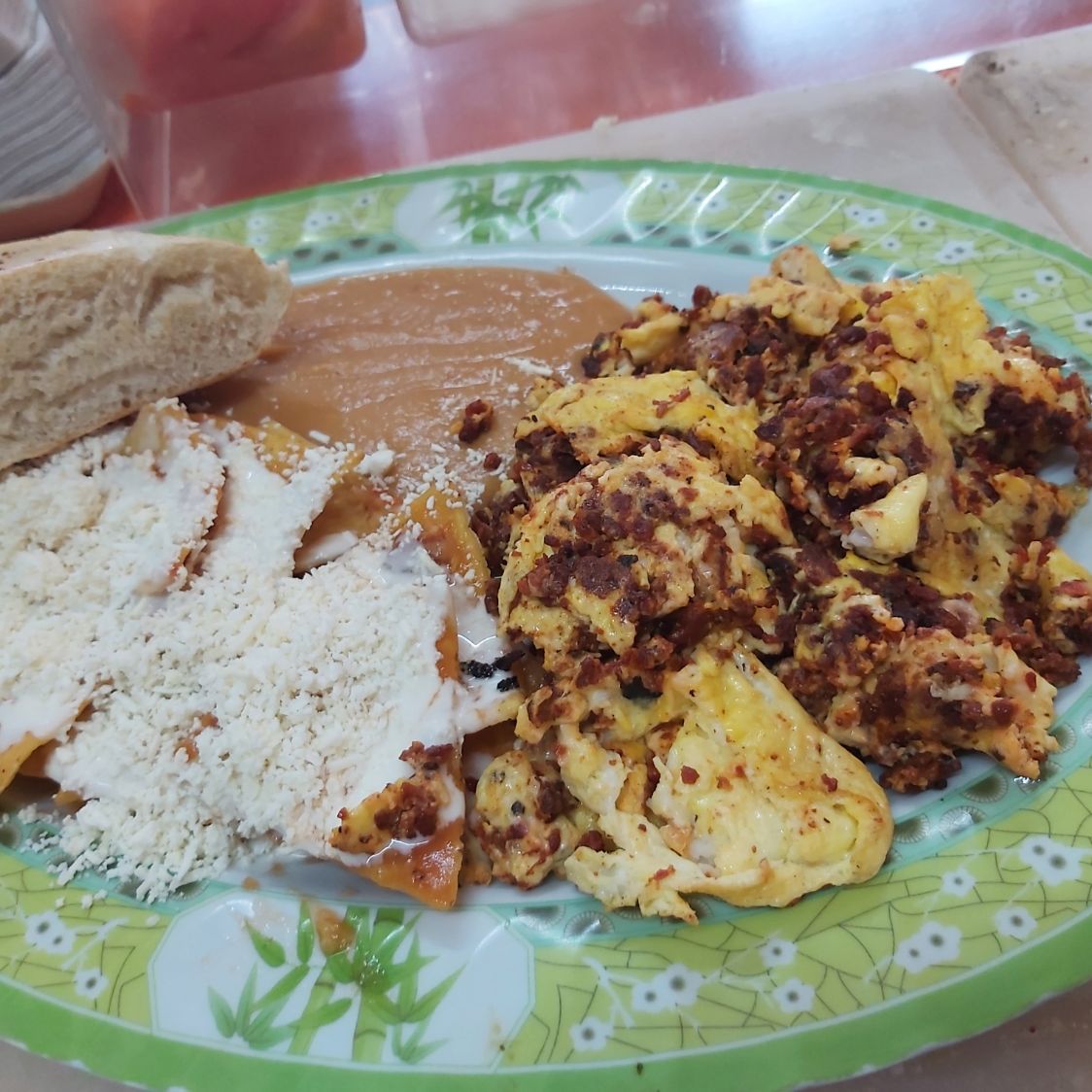 Chilaquiles rojos, servidos con queso, crema y frijoles.
