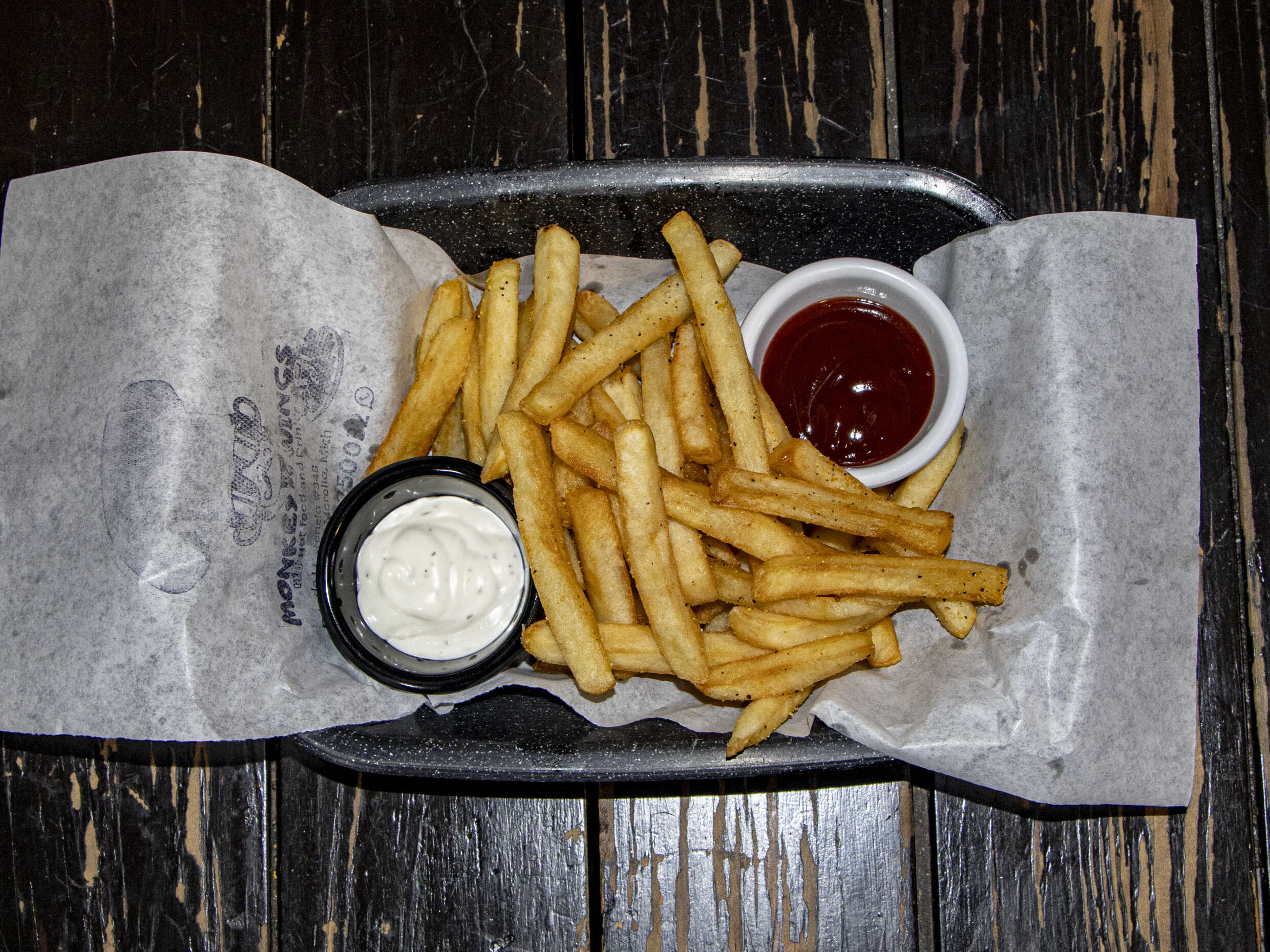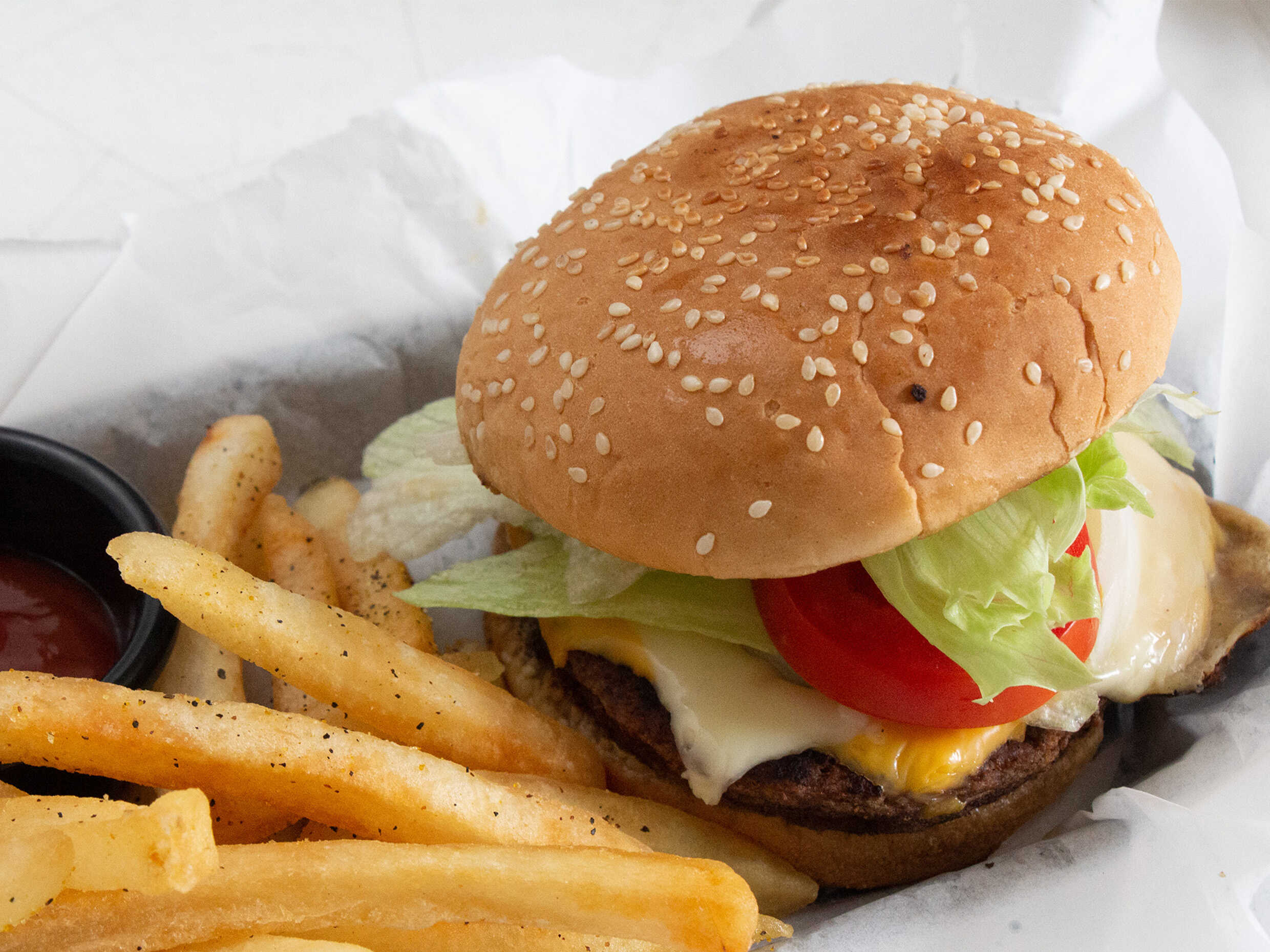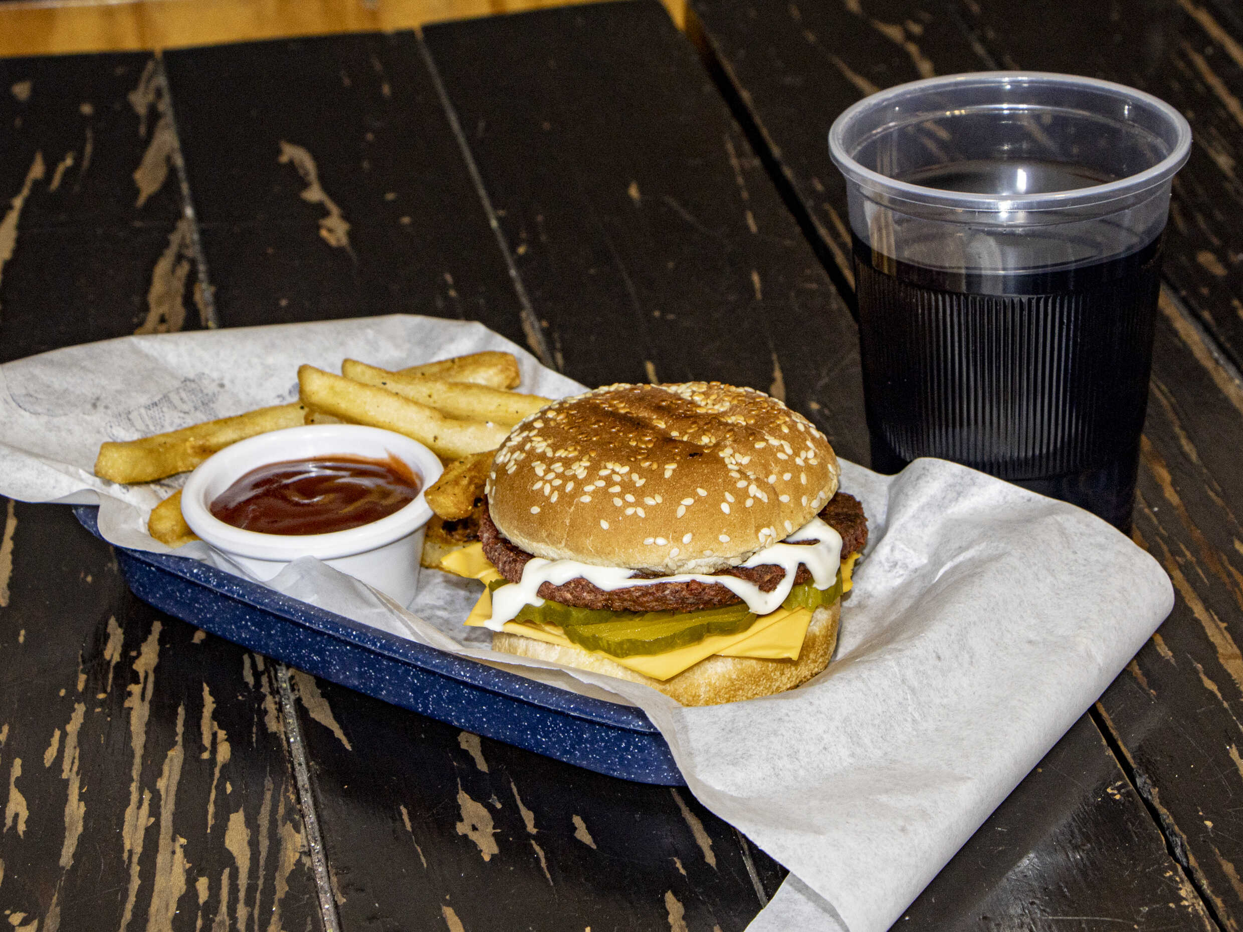 Hamburguesa de carne de res, queso amarillo, aderezo Monkey, pepinillos, (salsa opcional). Incluye porción de papas a la francesa y deep de cátsup.