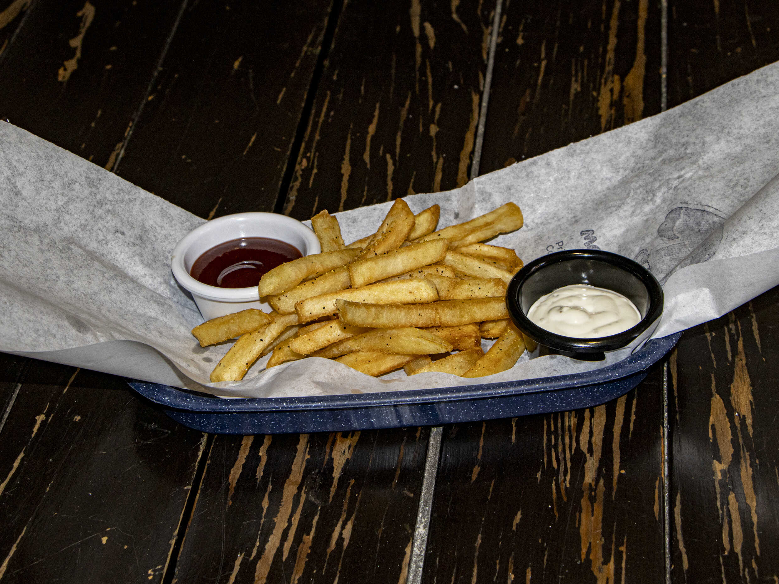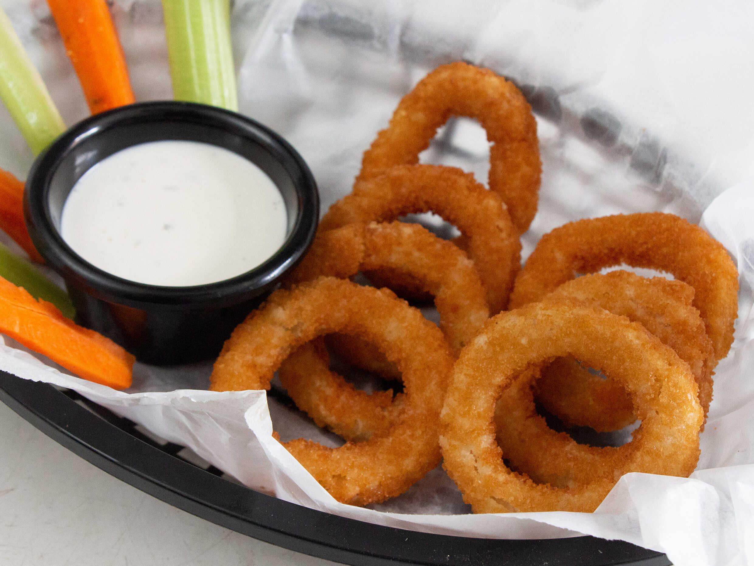 1 orden de papas a la francesa, 1 orden de aros de cebolla (7 piezas), incluye vegetales (zanahoria y apio) y aderezo.