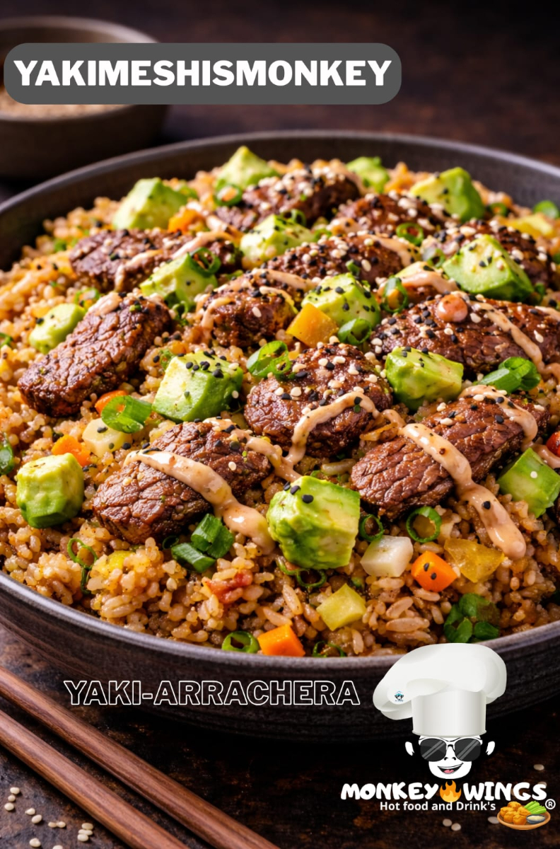 Arroz frito con calabaza, zanahoria 🥕, topping de aderezo Monkey, aguacate 🥑 & Arrachera