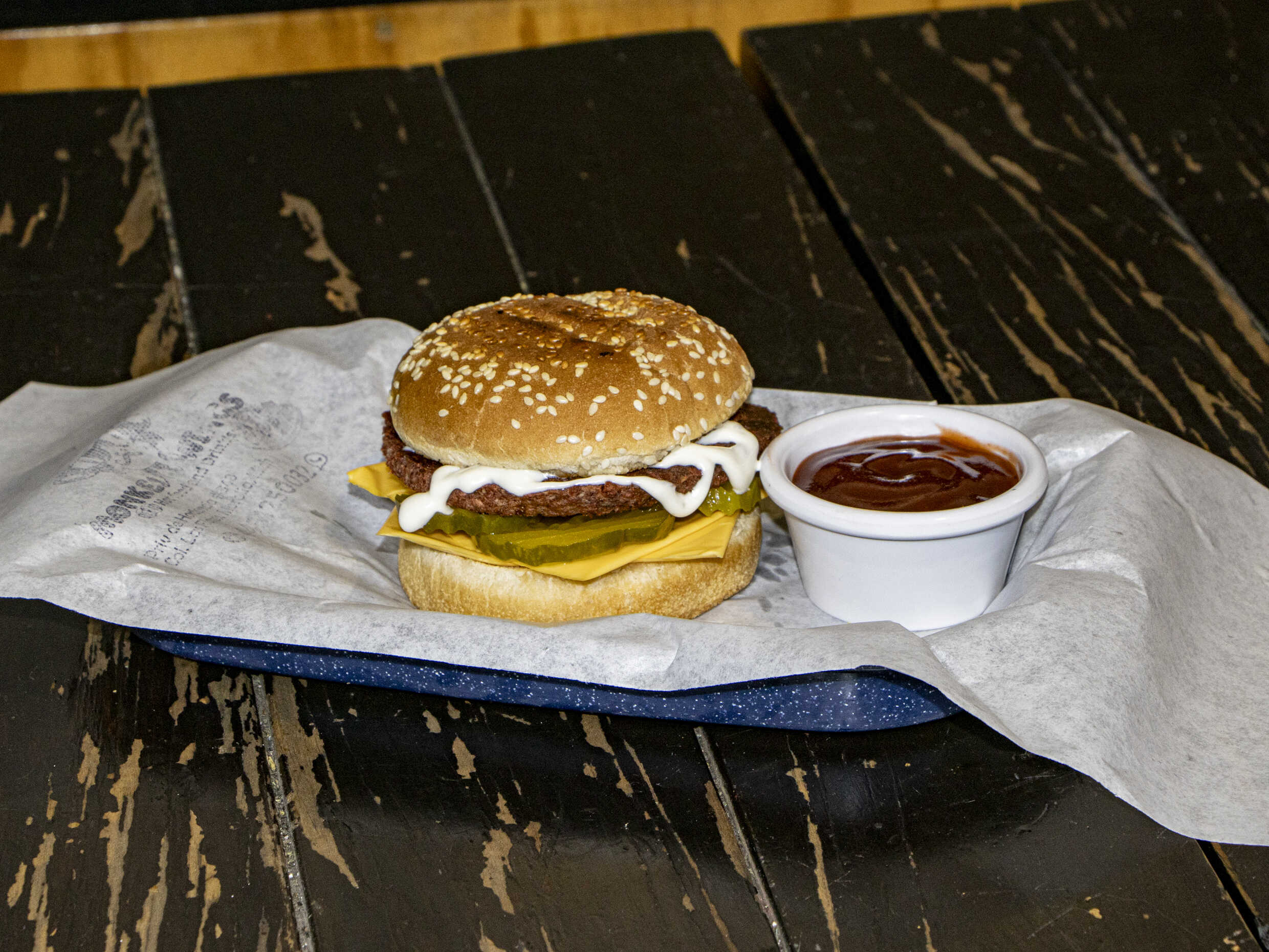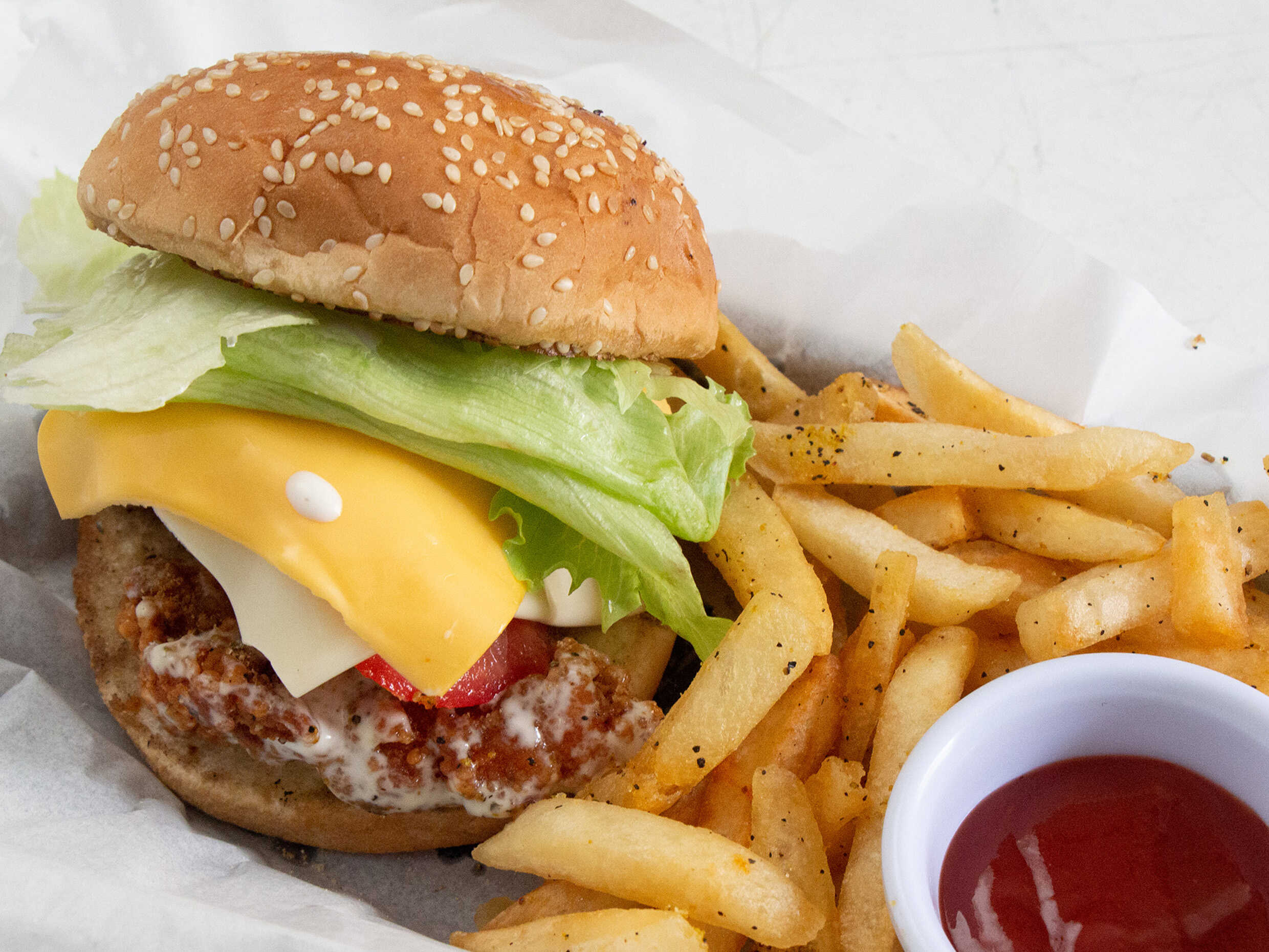 Hamburguesa de tenders, salsa de la casa, queso amarillo y pepinillos.