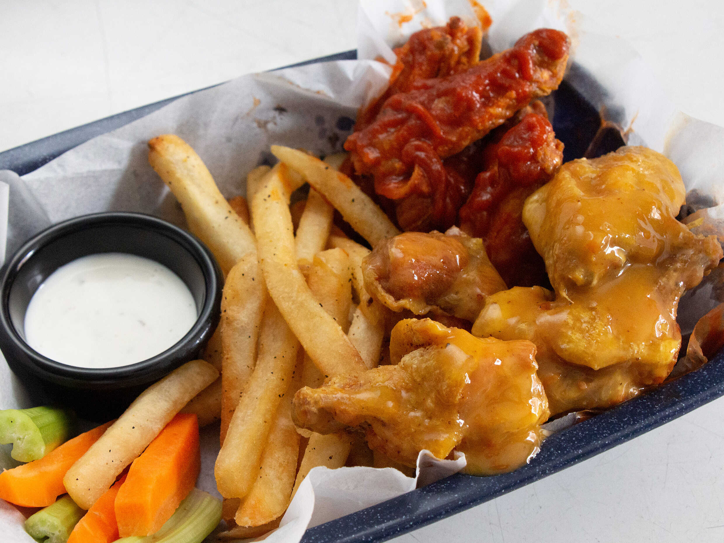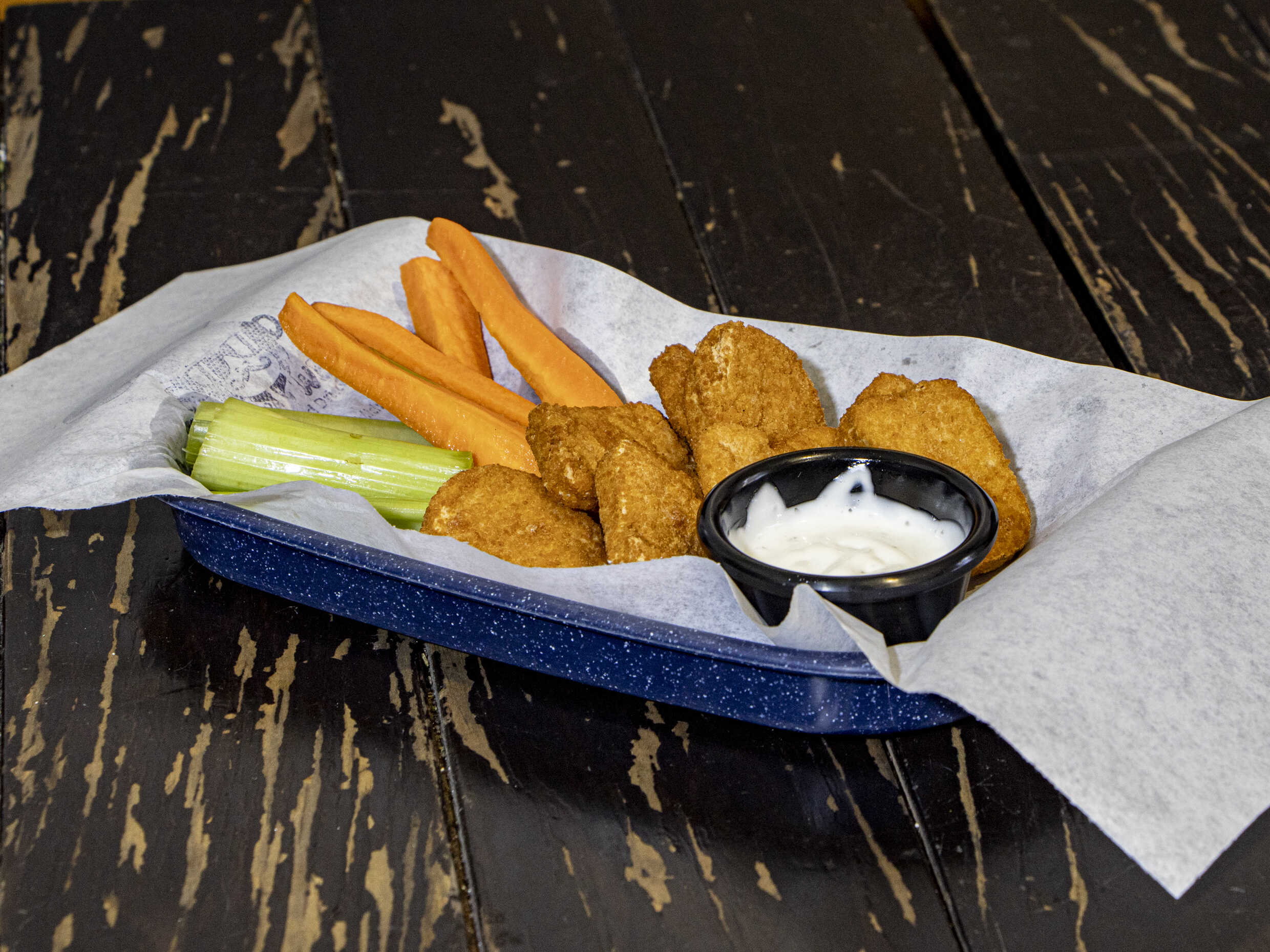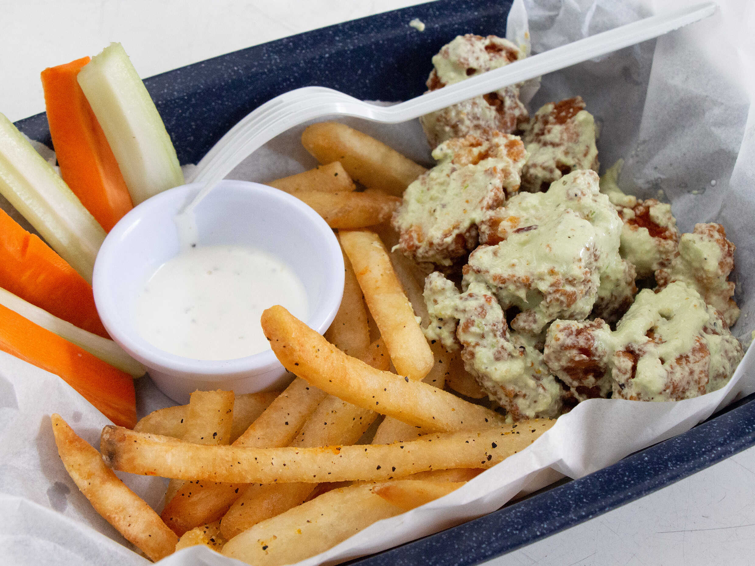 Con vegetales (zanahoria y apio), aderezo y salsa de la casa a elegir. Incluye 1 orden de papas a la francesa, 1 orden de aros de cebolla y 1 orden de dedos de queso (5 pzs).