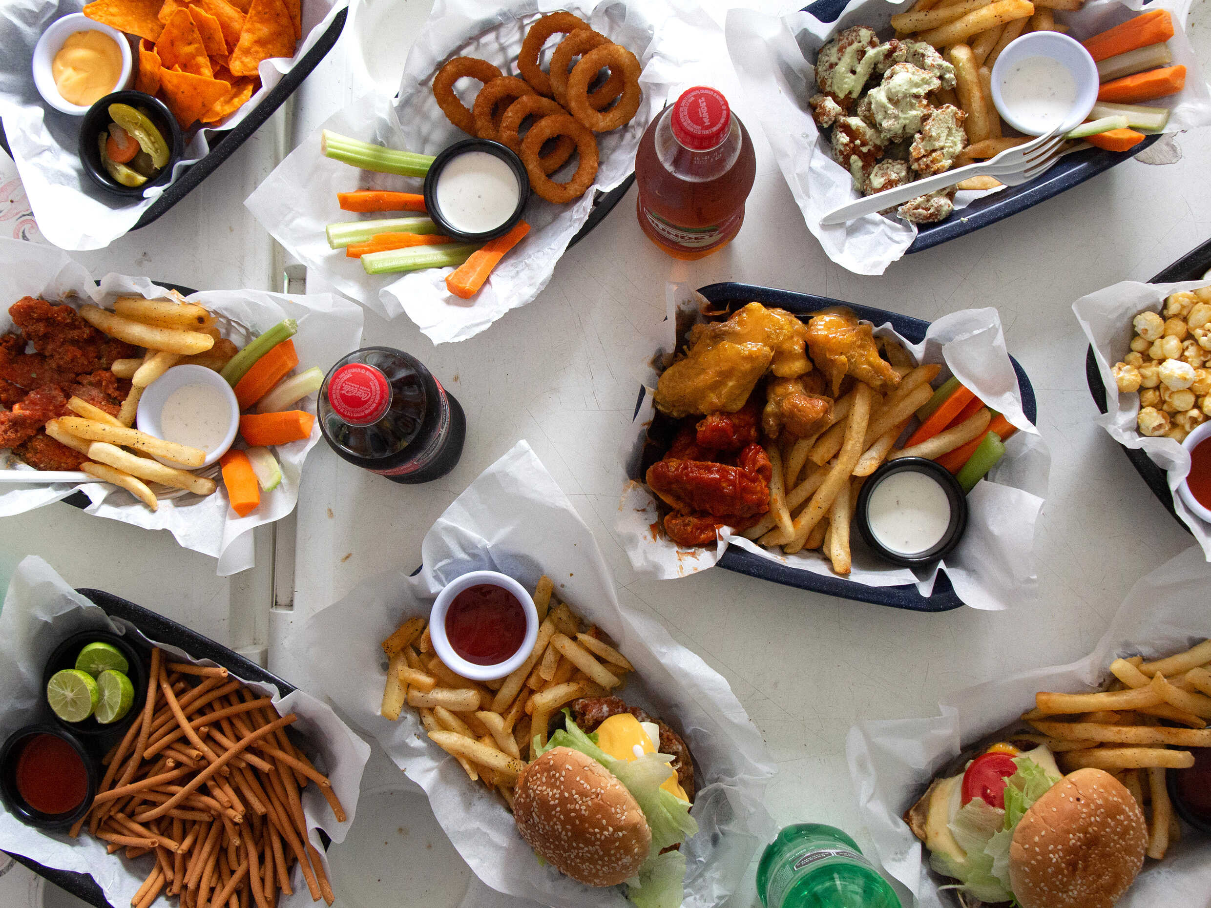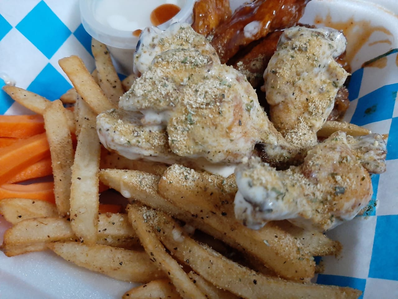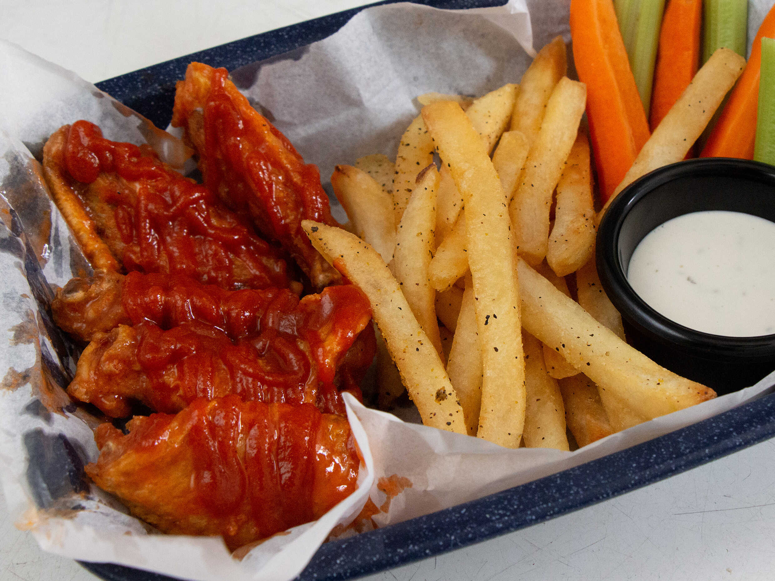 Con vegetales (zanahoria y apio), aderezo y salsa de la casa a elegir. Incluye 1 orden de papas a la francesa, 1 orden de aros de cebolla y 1 orden de dedos de queso (5 pzs).