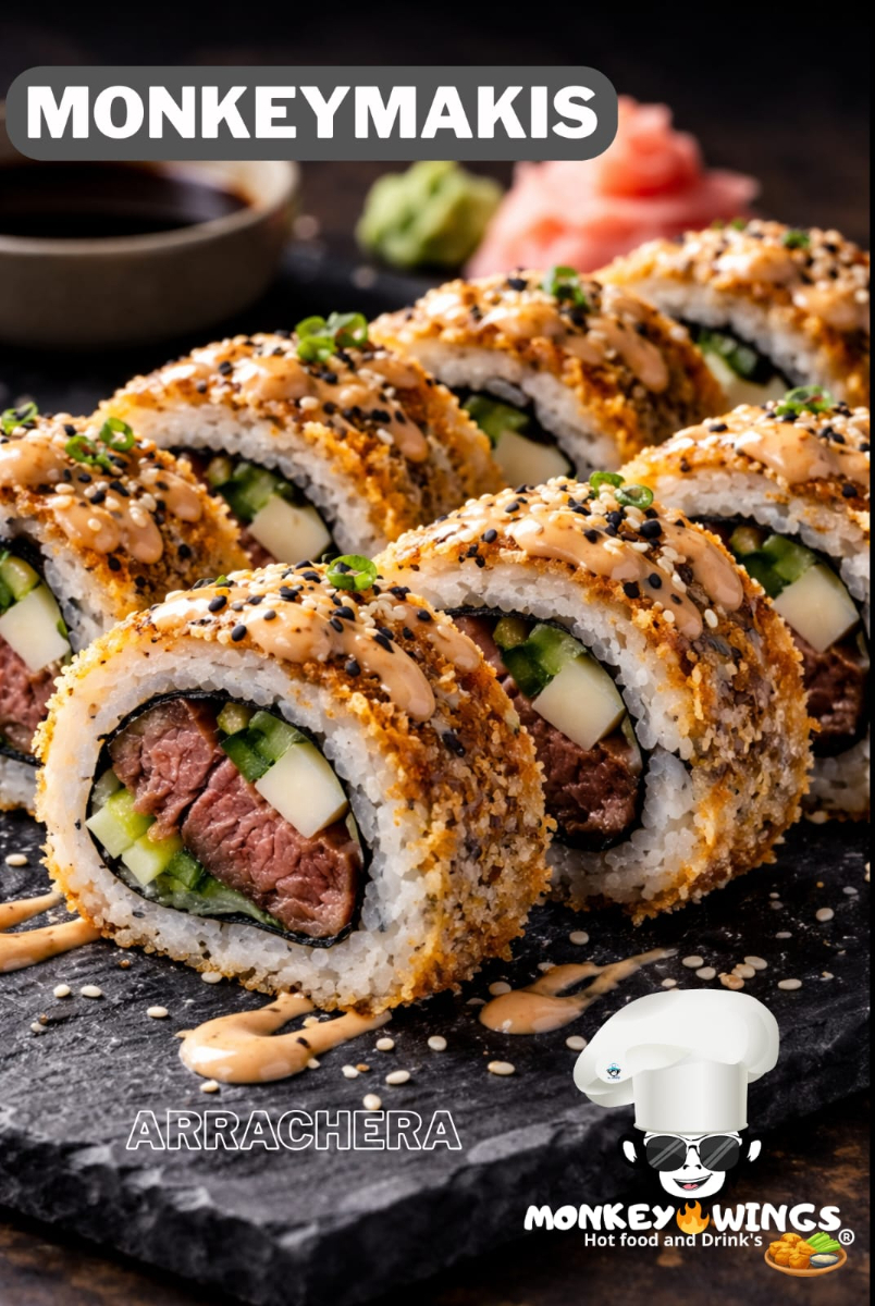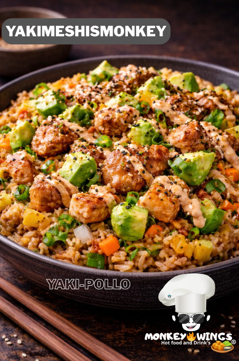 Arroz frito con calabaza, zanahoria 🥕, topping de aderezo Monkey, aguacate 🥑 & Camarones, Pechuga de Pollo y Arrachera