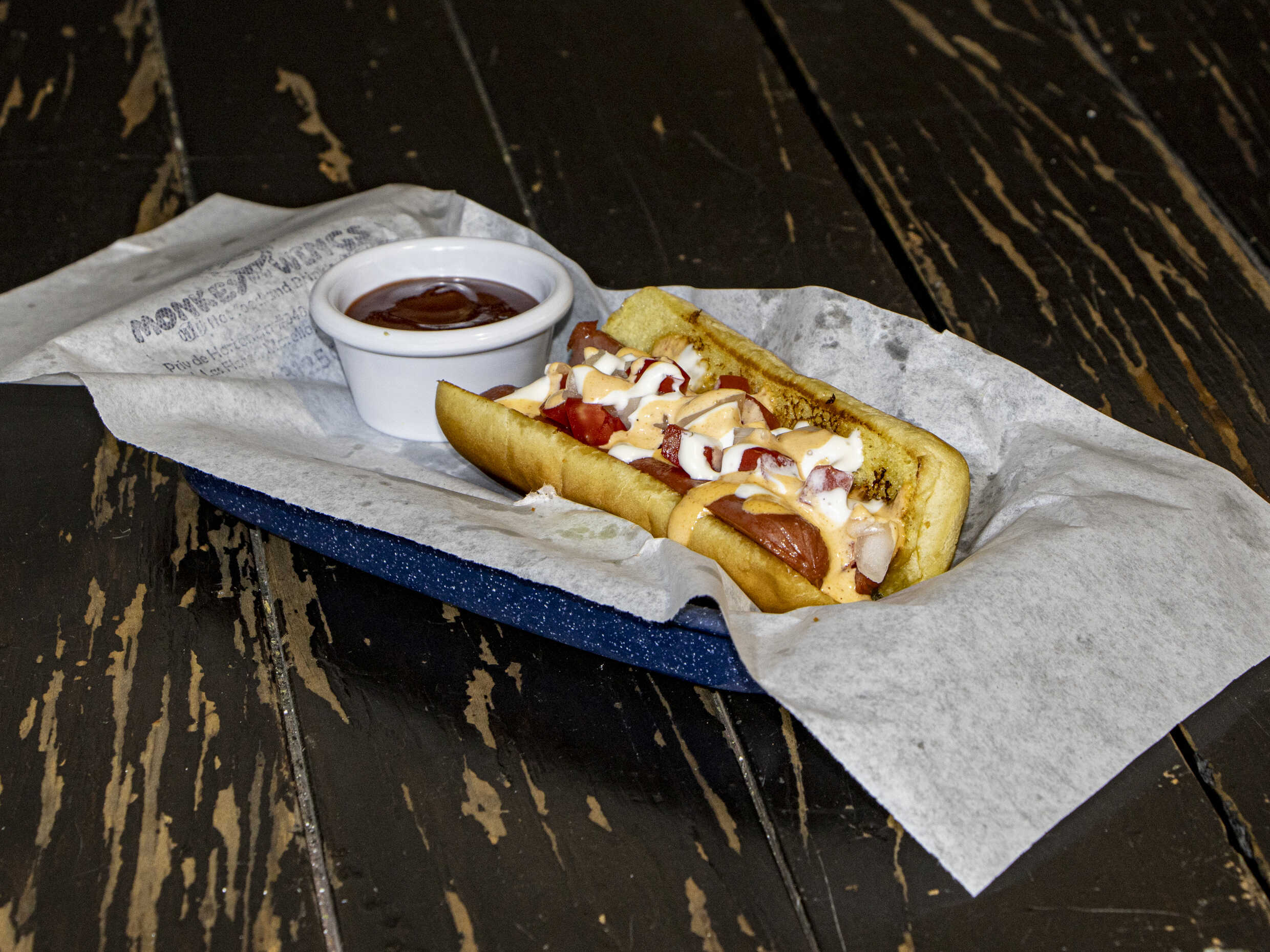 Salchicha jumbo de pavo a la plancha con tocino, jitomate y cebolla. Incluye deep de cátsup o aderezo. Opción de chile serrano.