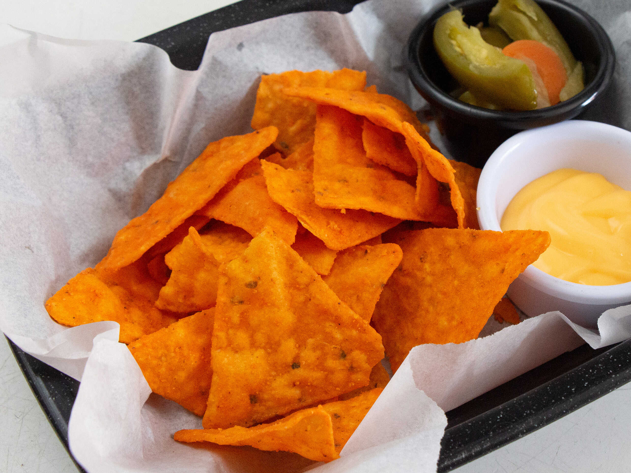 Totopos bañados en salsa house habanero, con cebolla, crema, queso gratinado, frijoles y porción de pan.