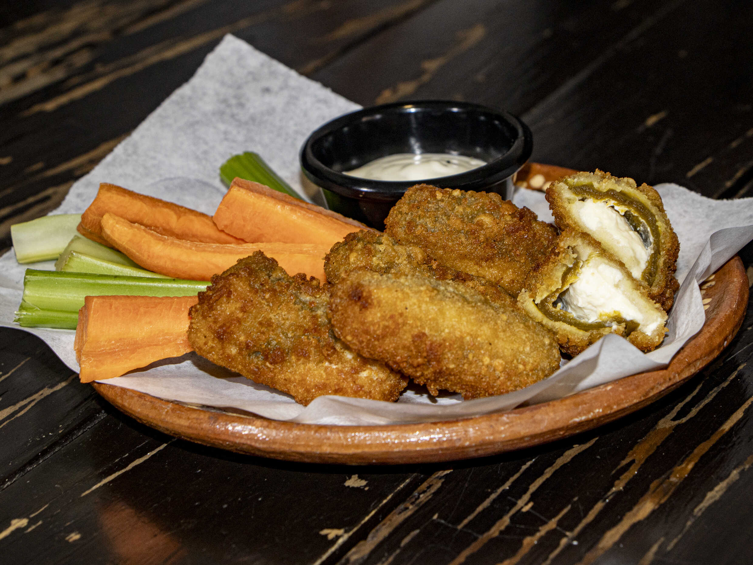5 piezas de Jalapeños rellenos con queso, incluye vegetales (zanahoria y apio), aderezo y salsa de la casa a elegir.