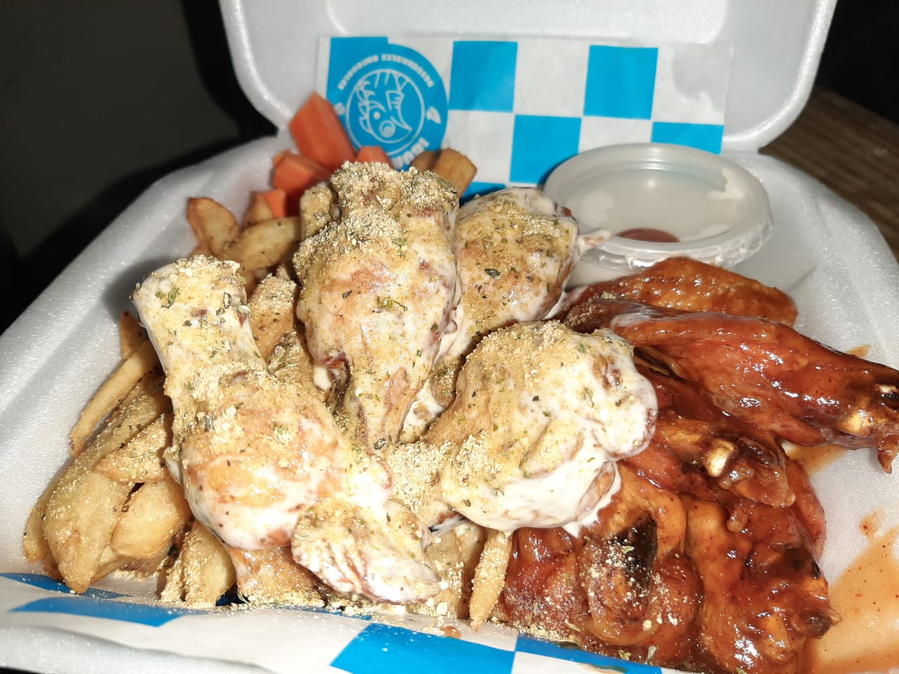20 alitas más 16 boneless o tenders (a elegir). Incluye 1 orden de papas a la francesa, 1 orden de aros de cebolla (7 piezas), vegetales (zanahoria y apio) y aderezo.