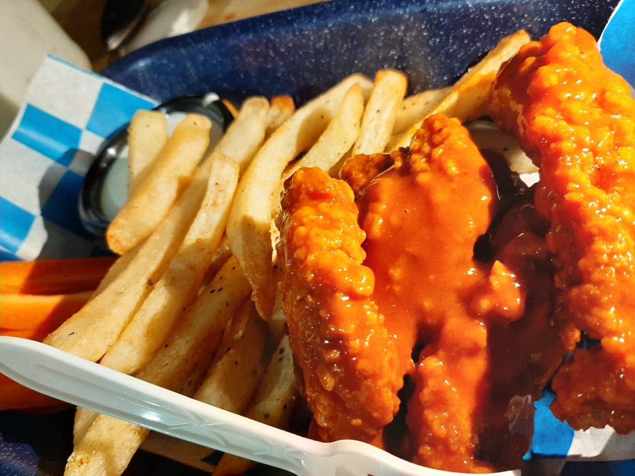16 Boneless o 16 Tenders, con vegetales (zanahoria y apio), aderezo y salsa de la casa a elegir. Incluye porción de papas a la francesa.
