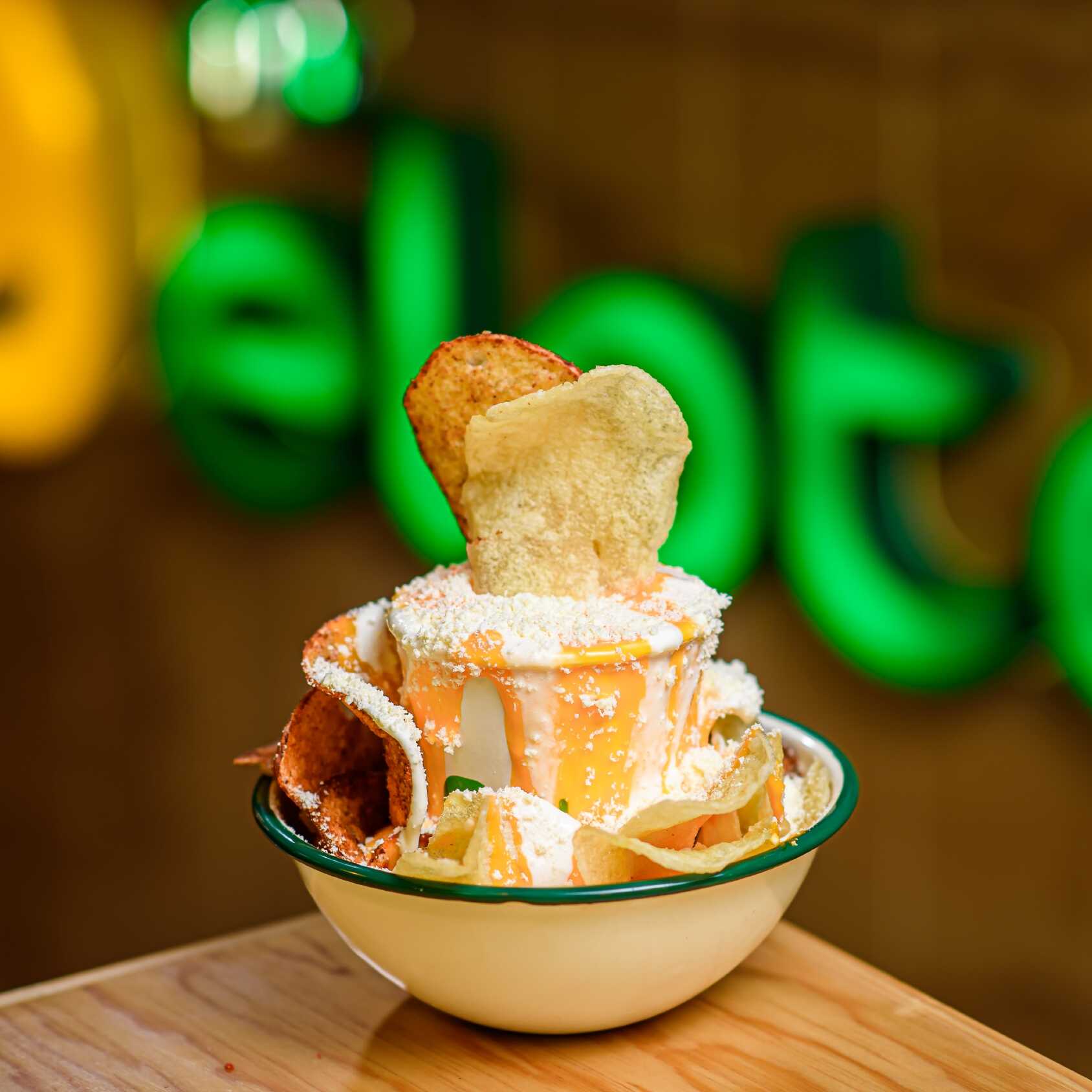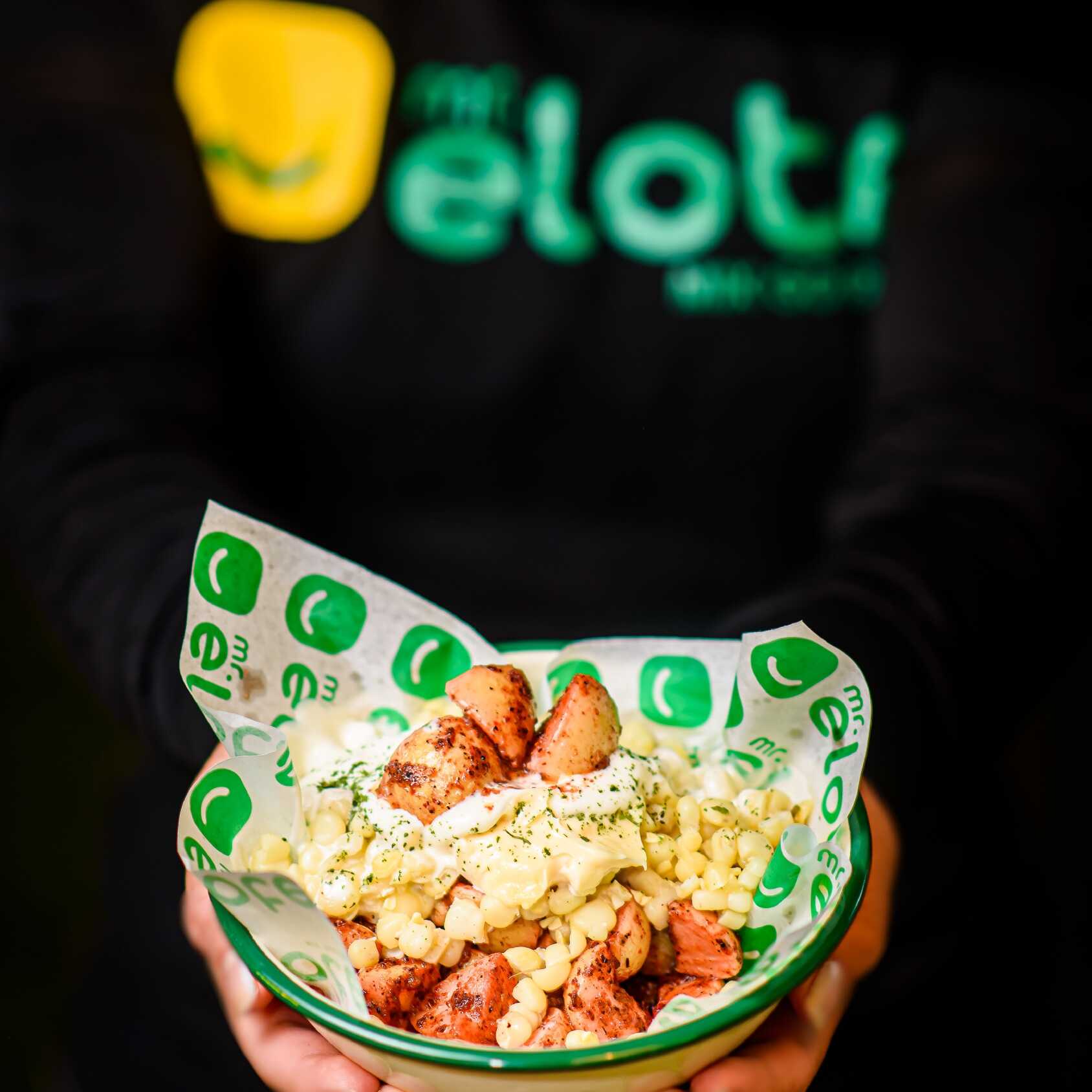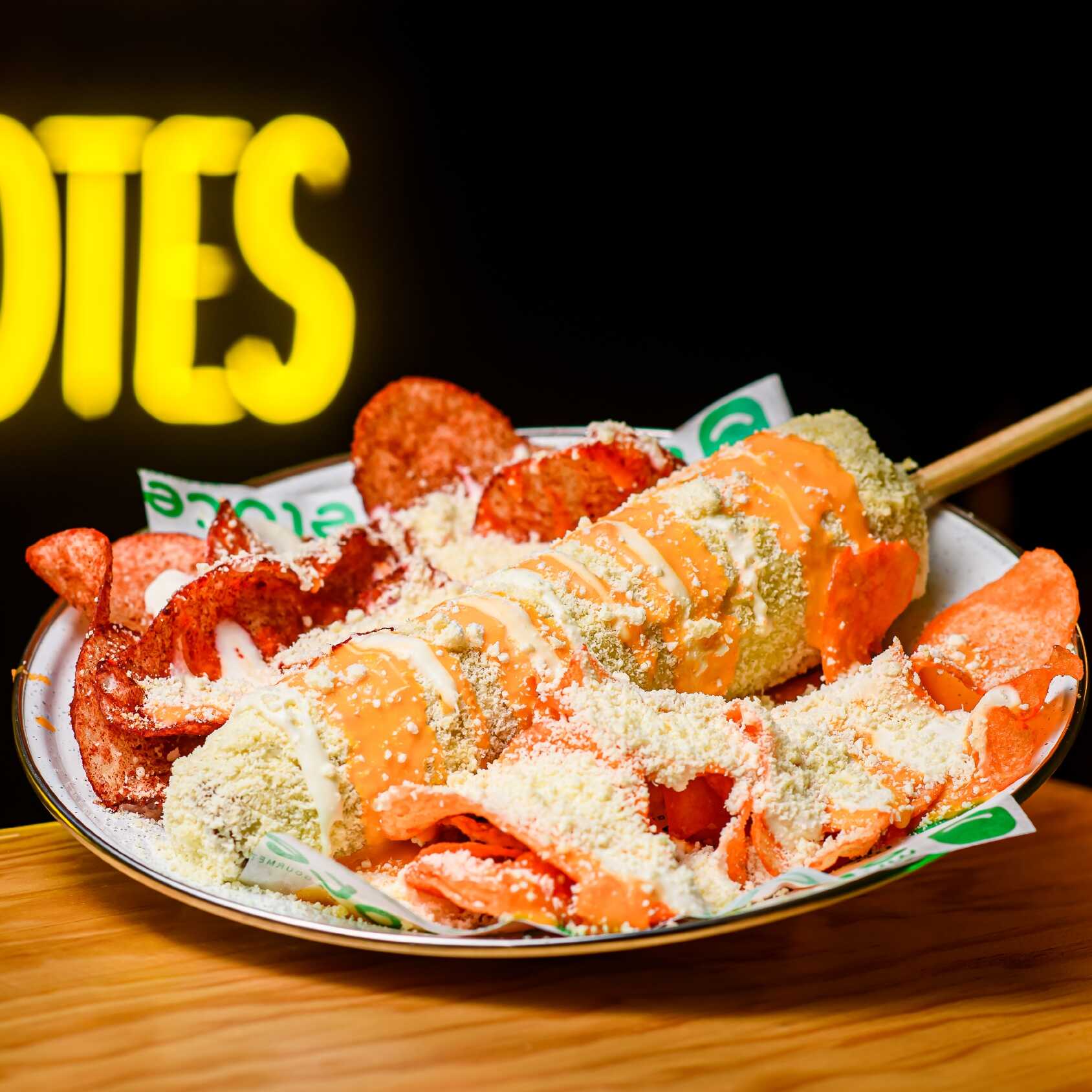 Elote tradicional en grano blanco, acompañado con papas de tu elección, bañadas en esquite, queso amarillo y crema.