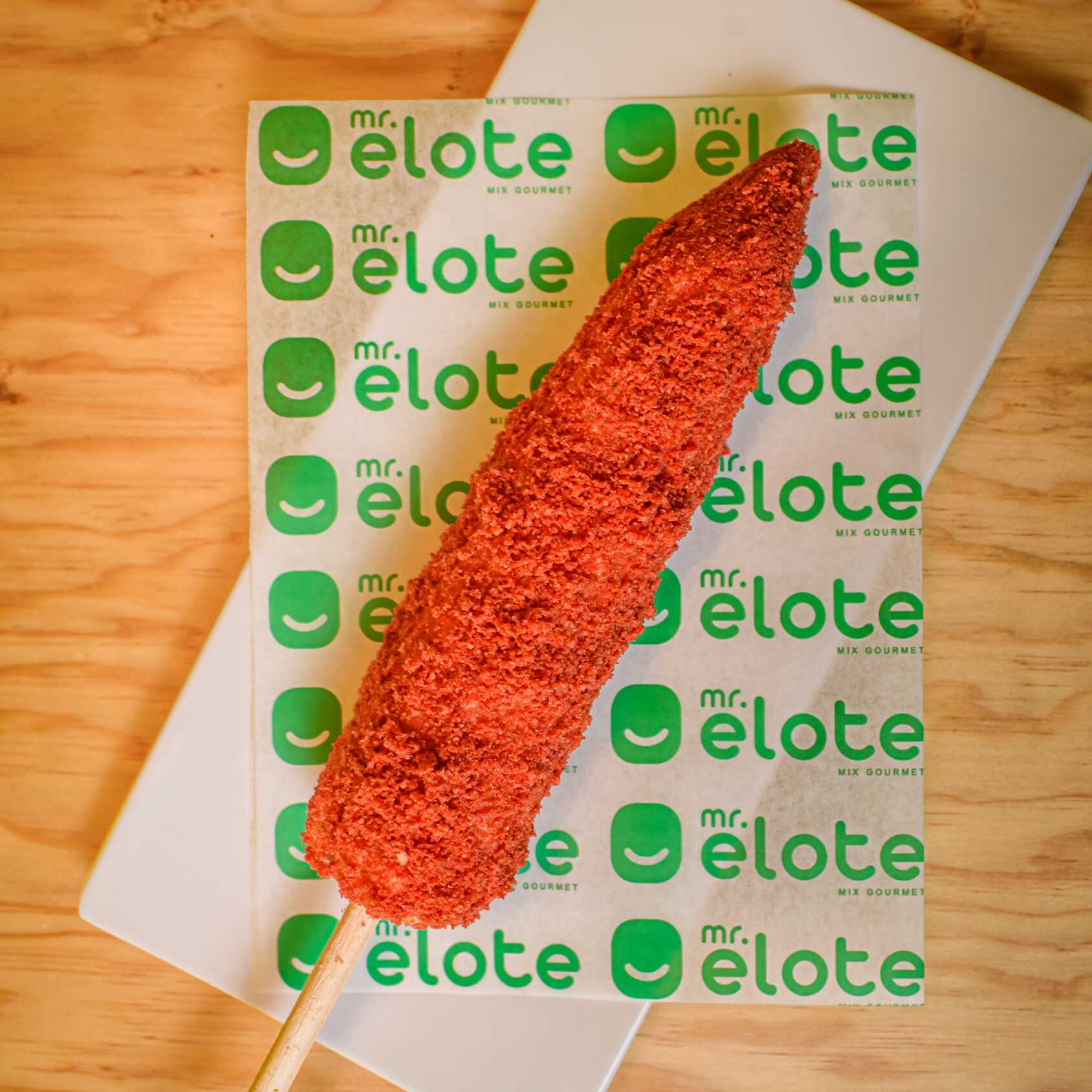 Elote en grano blanco, revolcado con papas trituradas de tu elección.