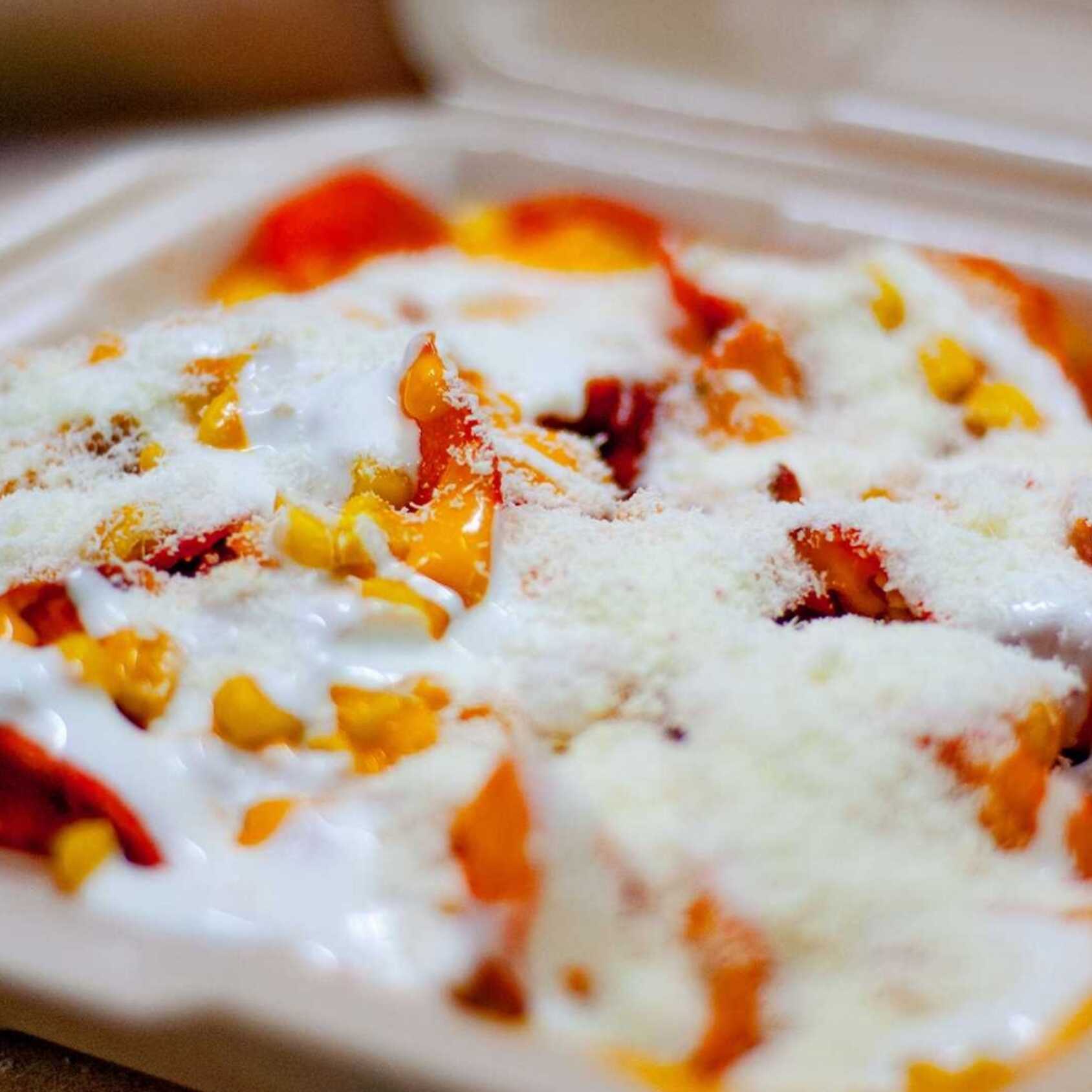 Papas a la francesa acompañadas de crema, mayonesa, queso gratinado y esquite blanco.