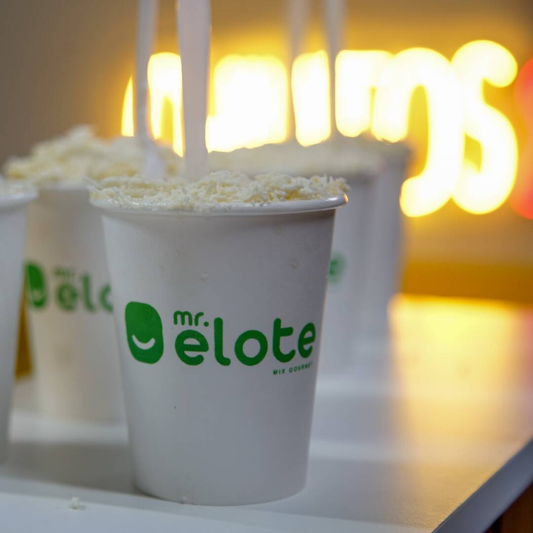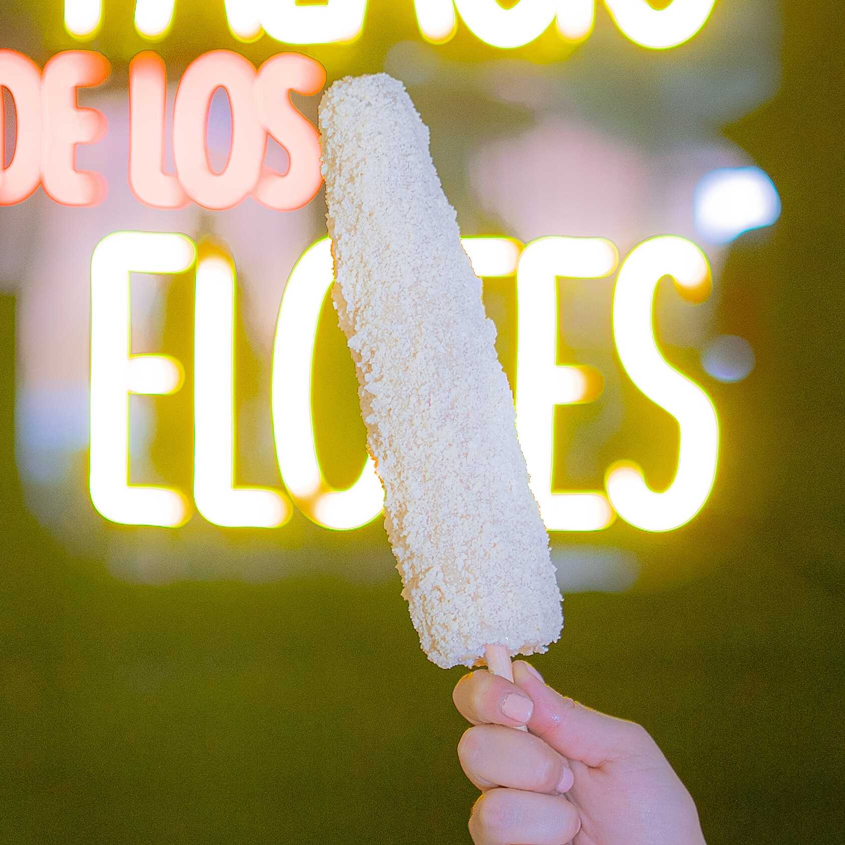 Elote entero en grano blanco, bañado en mayonesa y queso en polvo.