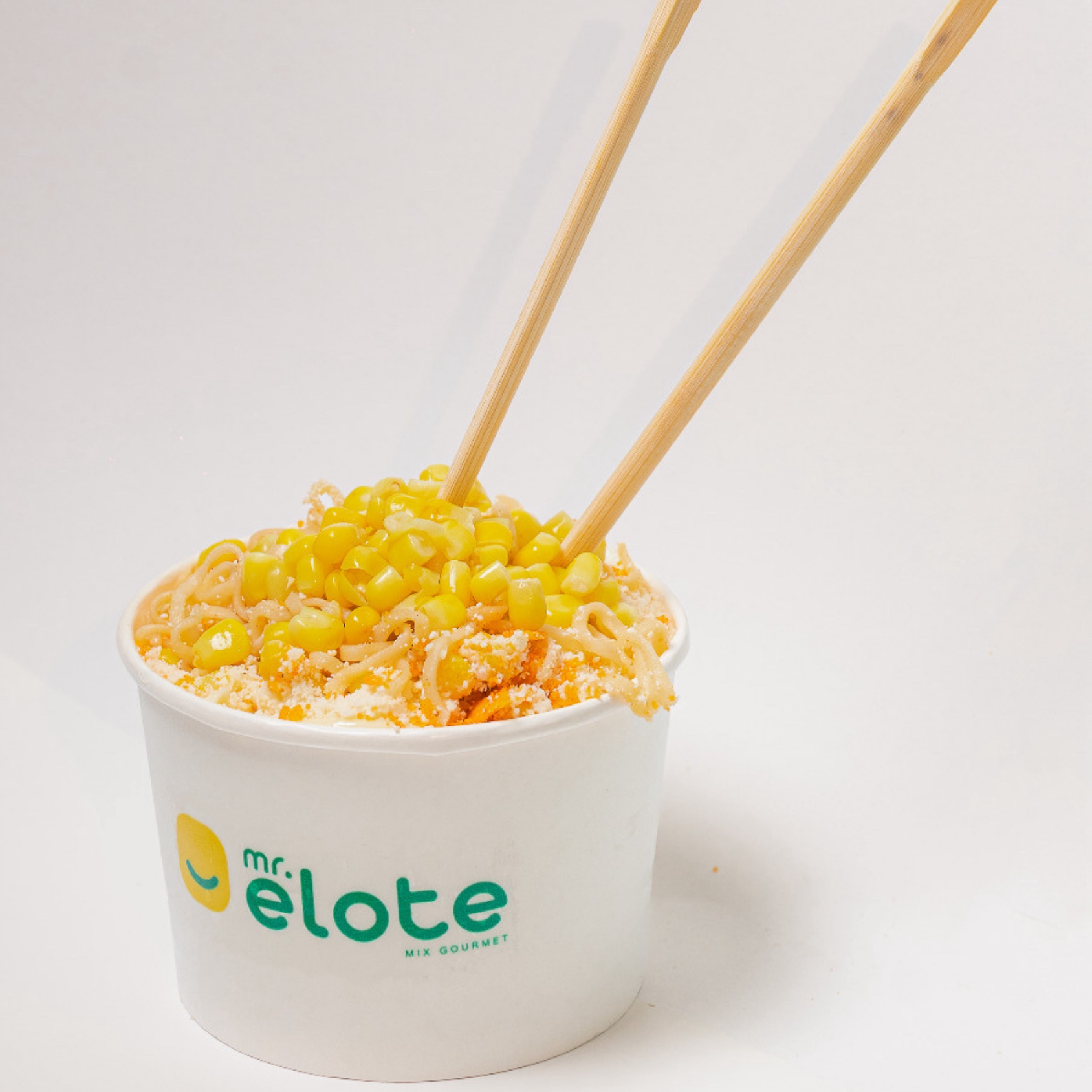 Sopa maruchan con elote en grano blanco, mayonesa, queso en polvo y Sabritas trituradas.