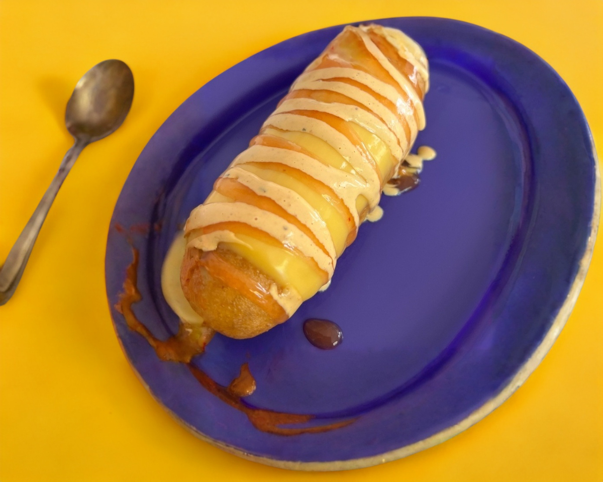 Salchicha cubierta con mezcla de harina con un toque dulce, acompañada de catsup, mostaza, mayonesa chipotle y queso
