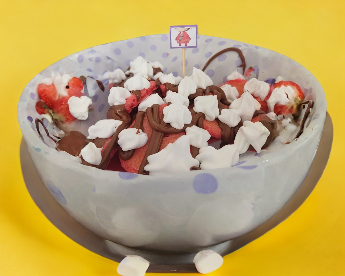 Frappe de fresa y chocolate blanco, con leche entera o deslactosada, con crema batida chispas y galleta