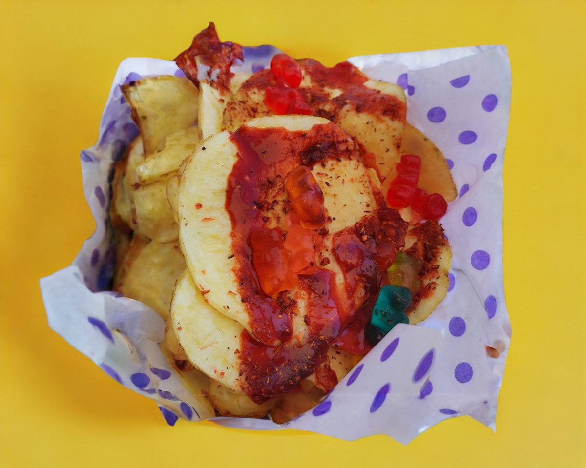 Papas doradas acompañadas de panditas, chamoy, salsa, Tajín, limon y sal