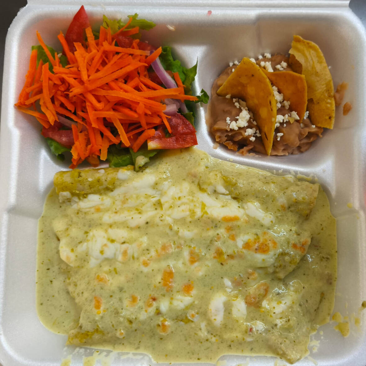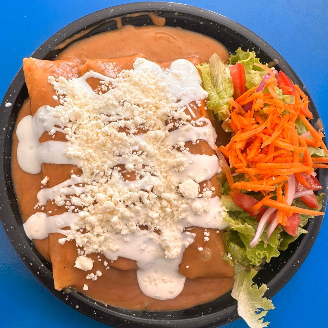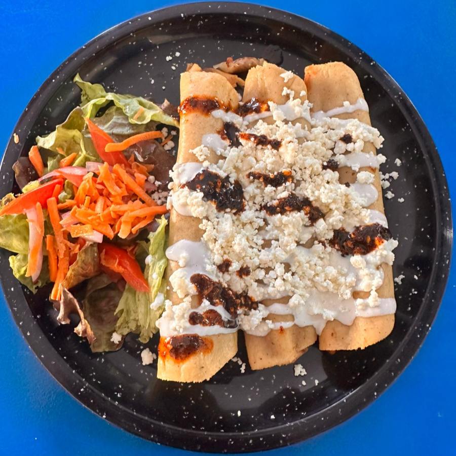 Rellenas de pollo, bañadas en salsa de frijoles, servidas con queso y crema. Acompañadas con ensalada.