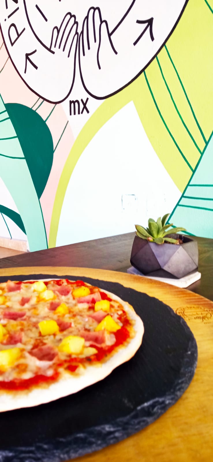 Una hamburguesa en una pizza, mini albóndigas de carne, queso mozzarella, queso cheddar, tocino, arúgula, jitomate y cebolla caramelizada.