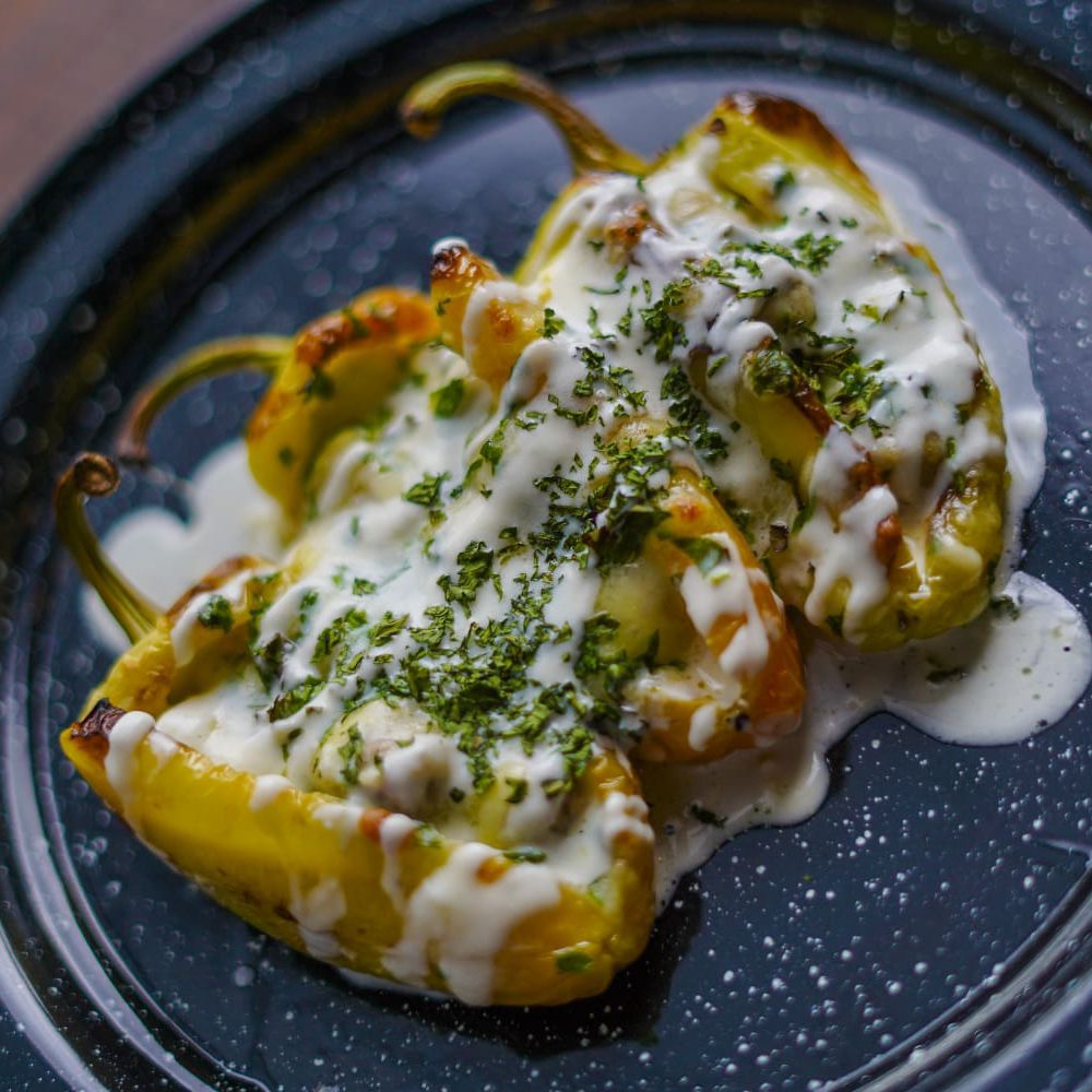 Chiles güeros rellenos de carne molida, bañados en crema y gratinados al horno.