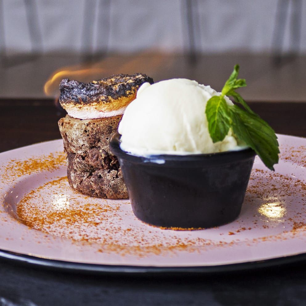 Buñuelo horneado con compota de pera y manzana, acompañado de helado de vainilla.