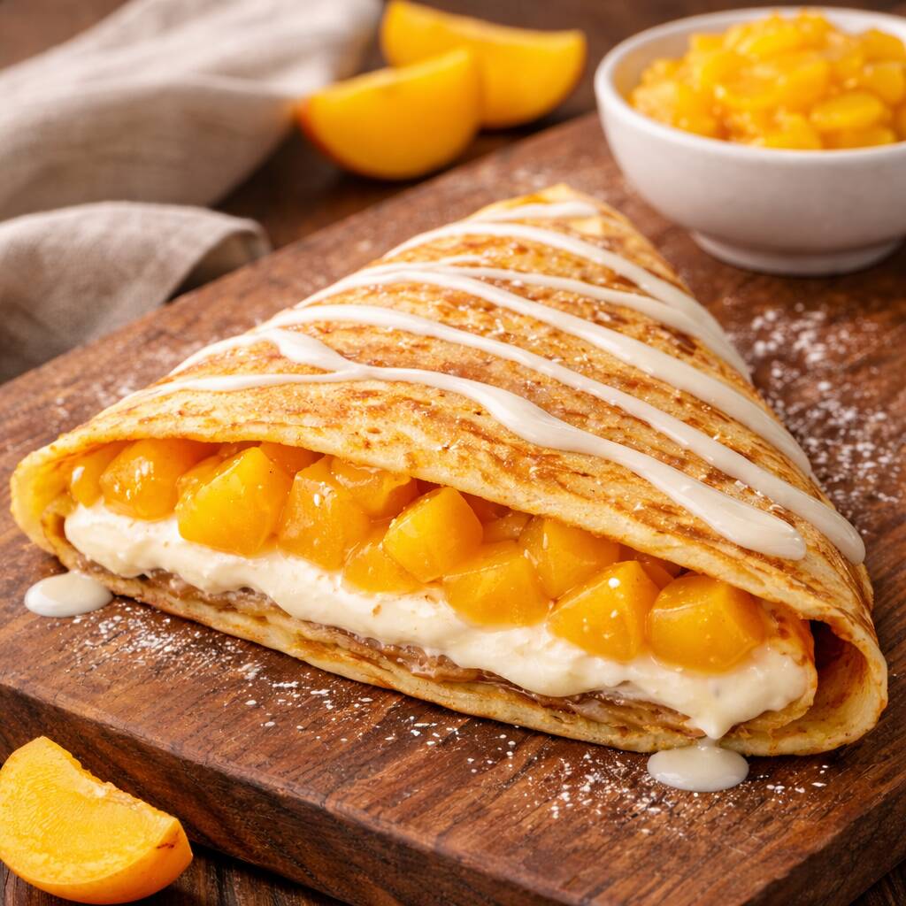 Rellena de suave queso crema, acompañado de trozos durazno en almibar, bañado en lechera.