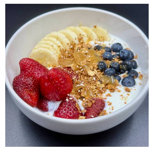 Yogurt natural, fresa, plátano, arándano fresco, granola y miel.